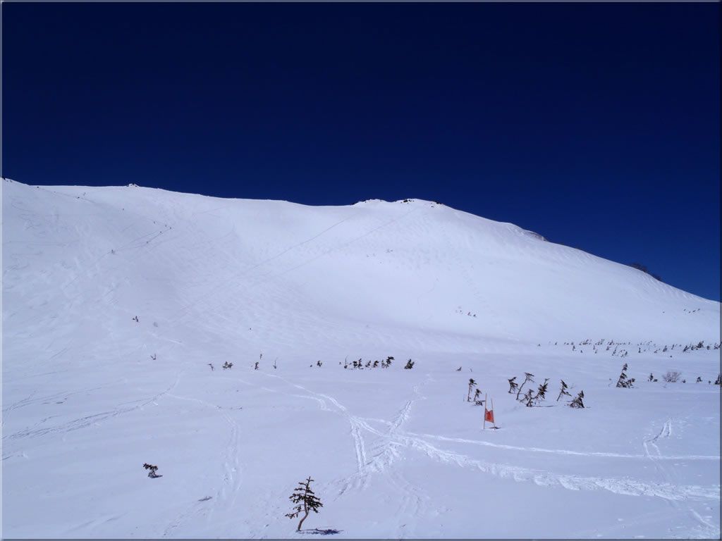既に2、3人ほど岩場直下の斜面を滑り降りていきましたので、私はノートラックバーンを求めて(^^; 斜面北側に移動します。ところで北側の岩場では数人ほどがなにやら作業をしていました。ここに気象観測用の機器が設置されていると聞いていますので、そのメンテナンス?をしているのかも知れません。