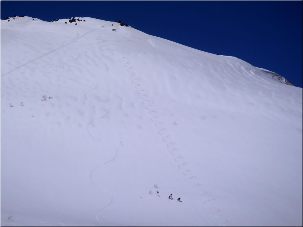 この先の斜面ですが、先ほど作業していた岩場に真っ直ぐ登ってきたトレースが2本、斜面を大きく横切って付いているではないですか。ノートラックバーンを滑る予定でしたので、これはかなりショックです(^^;。どこを滑ろうか再び迷い、結局トレースを避けて再び北側にトラバースして、このノートラックバーンを滑ることに決定。