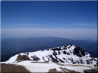 7合目までなんとか滑って、そこでスキー板をザックに付けて坪足で下ります。帰りはかなり足に来てしまい、へとへとになりながら駐車場まで下りました。14時30分、駐車場到着。下に降りるとまるで真夏のような暑さでした。