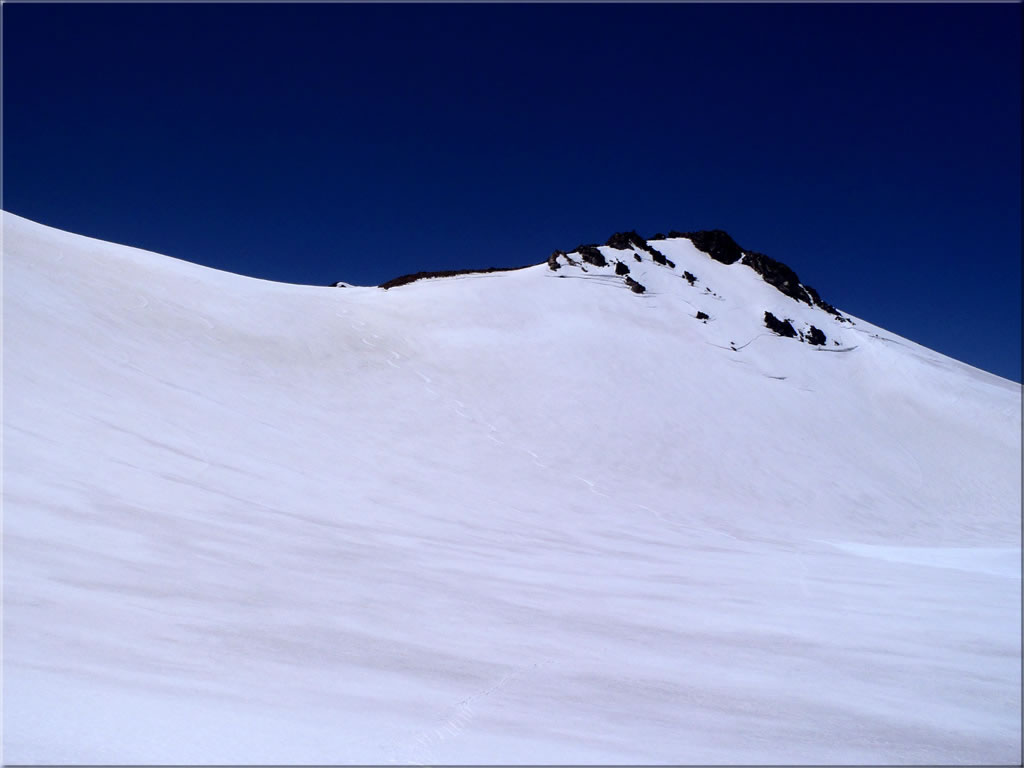 山頂直下は強風の影響で雪が少しかためですが、でもアイスバーンではないのでなんとかなるでしょう。では滑ります。
