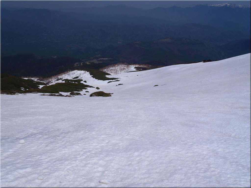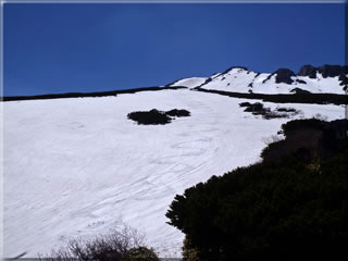 この先は一面の残雪です。どこを登っても良いのですが、とりあえず夏道登山道のある辺りをそのまま坪足で登っていきます。雪も表面はゆるんでいますが、下の方は締まっていて、坪足で問題なく登っていくことが出来ました。