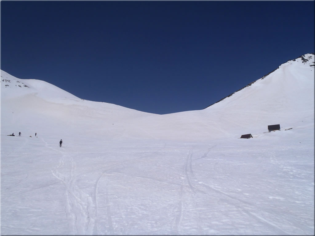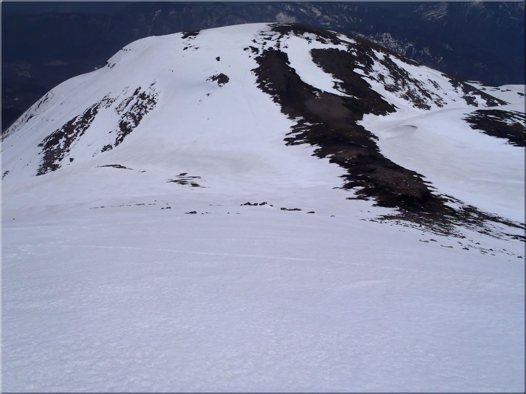 この斜面はほとんど滑った跡は無いのですが、堅いバーンの上のざらめが数センチしかなく、あまり快適ではありません。しばらく滑ってから諦め、斜面をもう少し左側に切り替えて今度はこの斜面を滑ってみることにします。