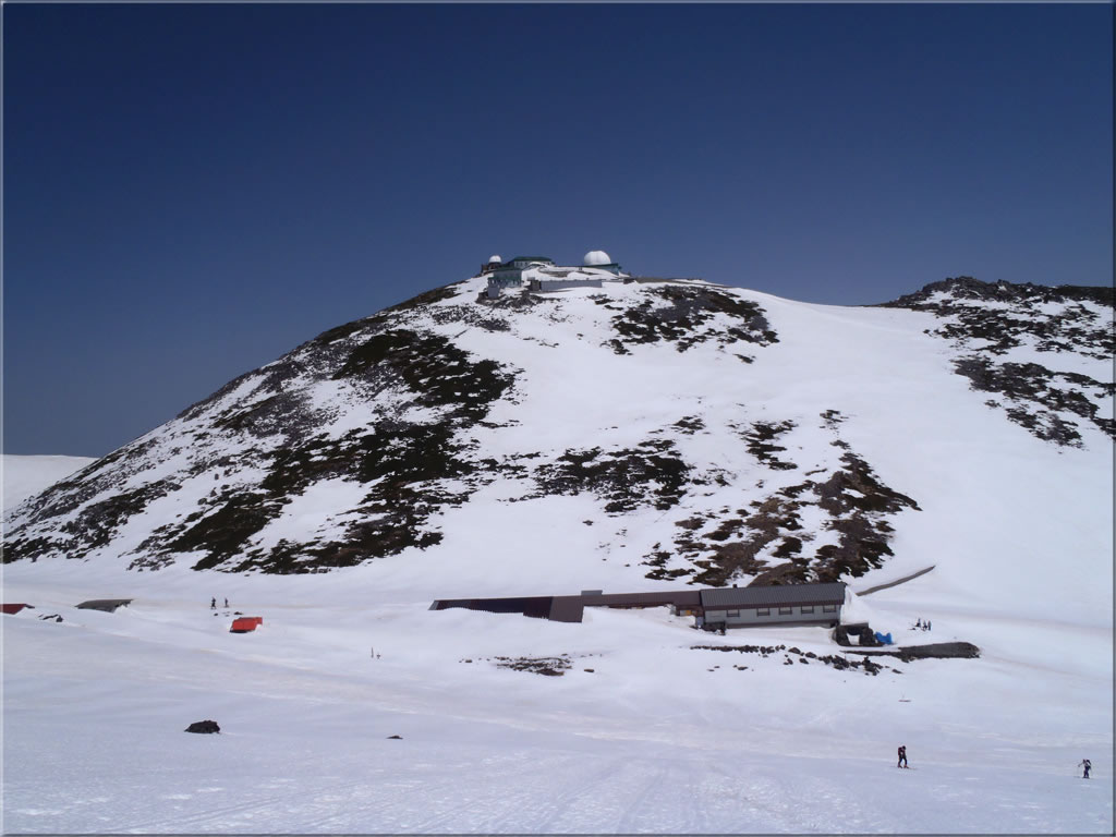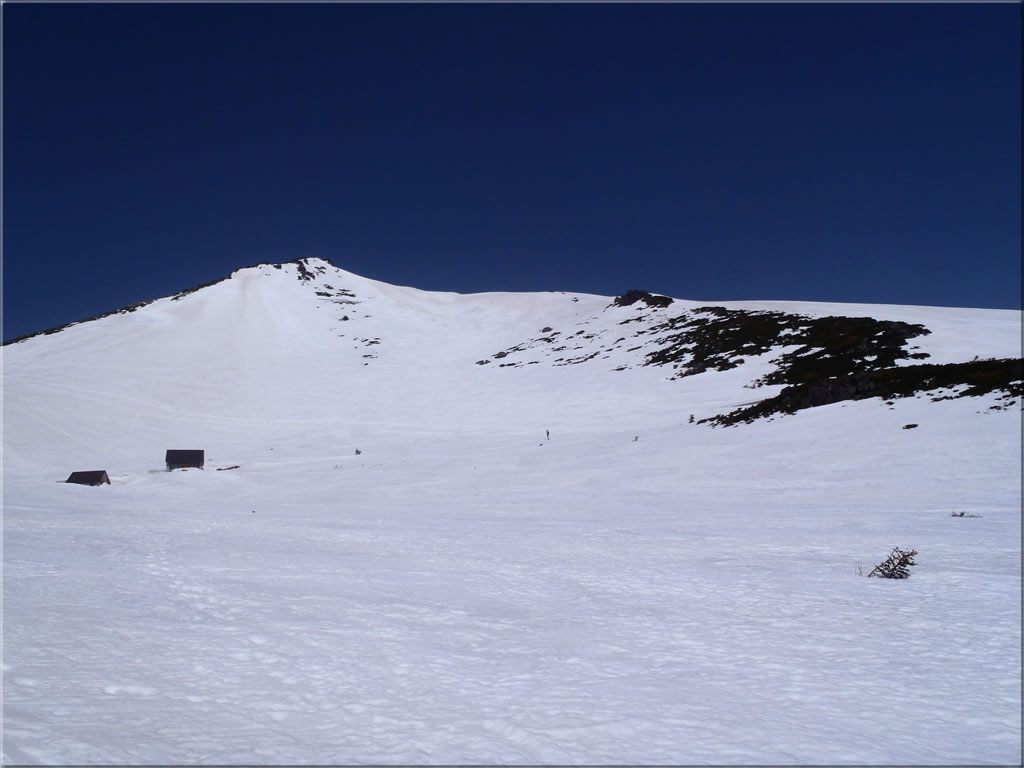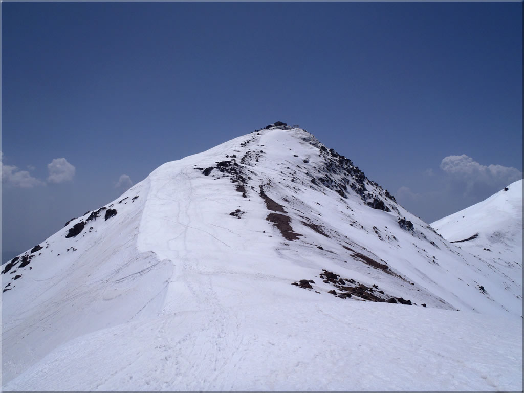 剣ヶ峰をズーム。ゴールデンウイークは連日快晴で多くの人が訪れたようで、既に斜面はシュプールで一杯でノートラックバーンはほとんど無さそうです。さて今回はどこを滑りましょうか。でもせっかくのこの穏やかな天気ですので、とりあえず剣ヶ峰山頂まで登ってから滑るルートを考えることにします。