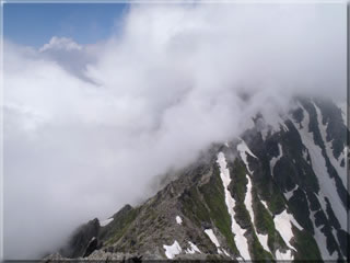 ここで今日2回目の休憩とします。着いた時はガスっていましたが、間もなくガスが切れて前穂の急斜面が突然目の前に現れました。