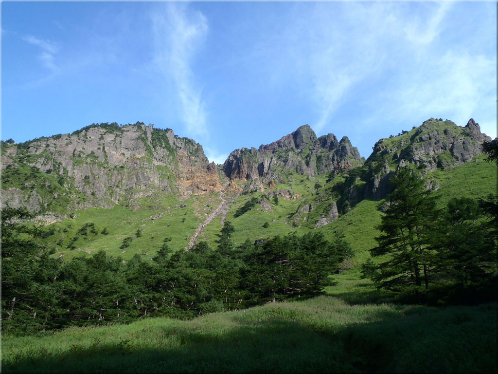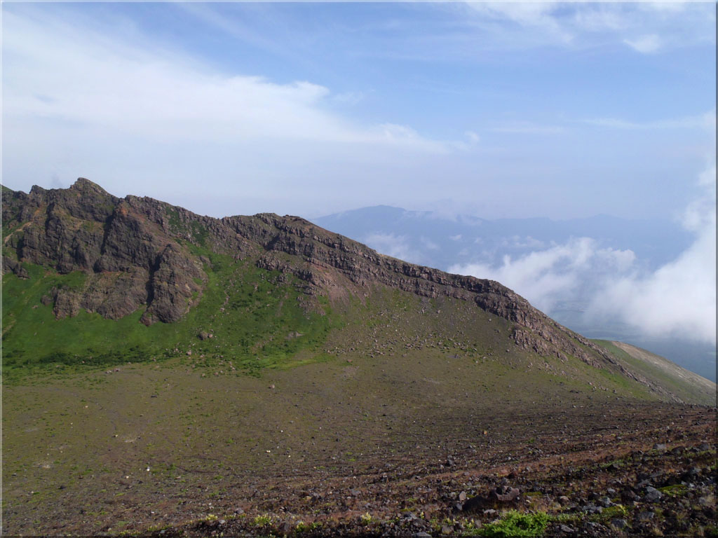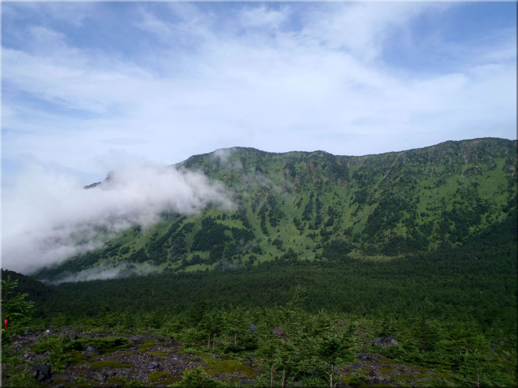 後ろを振り向くと、黒斑山を含む外輪山が意外と下の方に見えています。