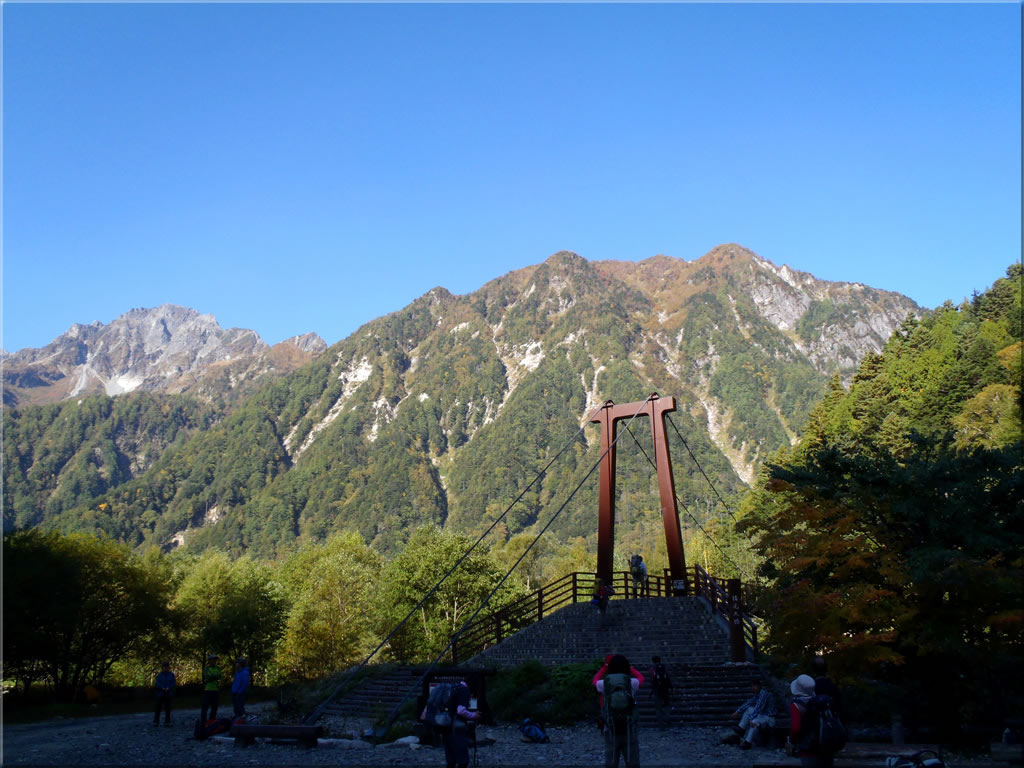 バスを降りて川沿いを河童橋方面に歩いていきます。そして6時27分、河童橋到着。目の前には奥穂、前穂がきれいに見えています。この時点で今日は涸沢で過去最高の天気で紅葉を楽しめると信じていたのですが...(^^;。