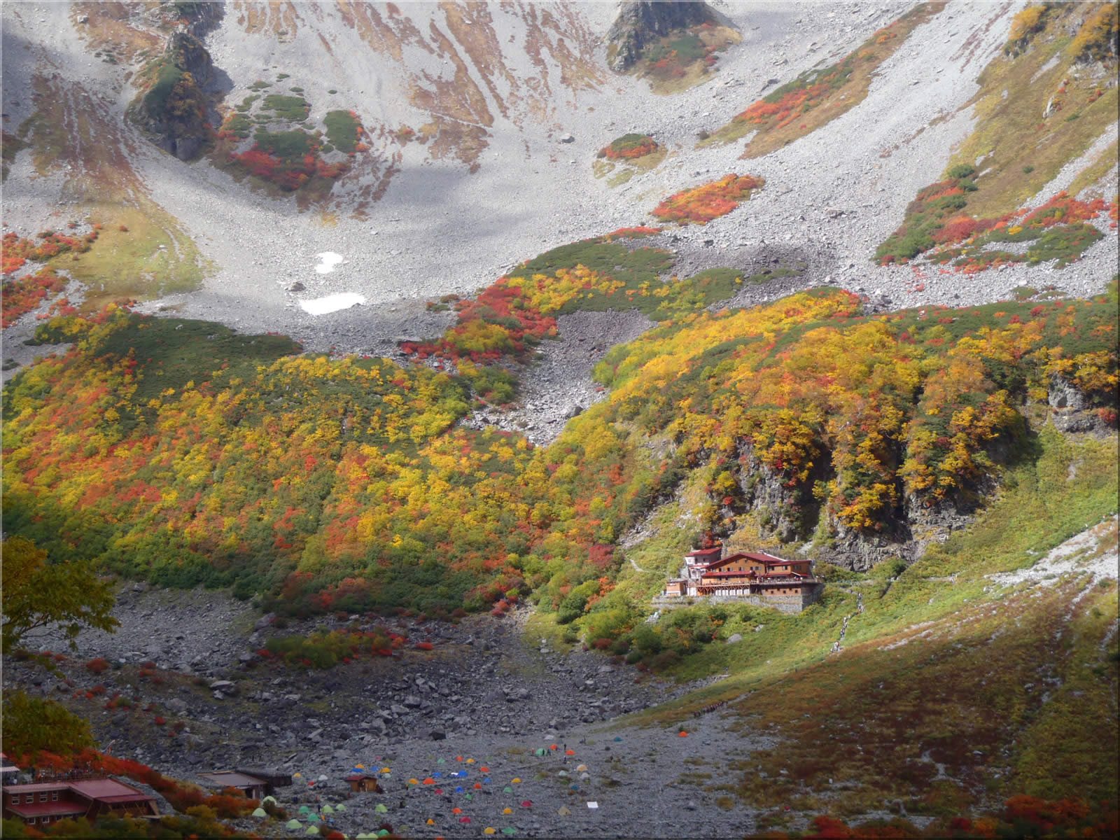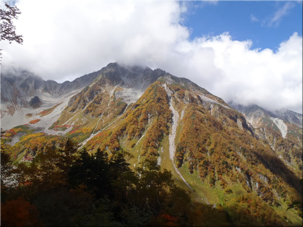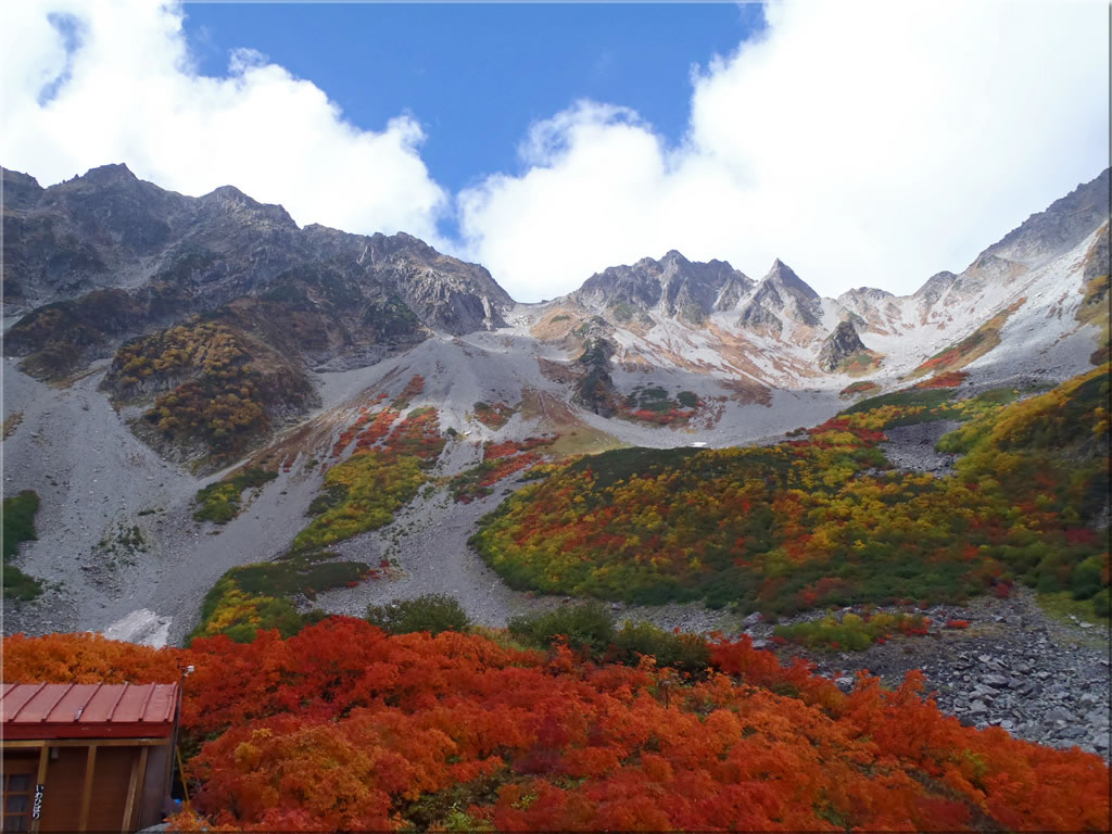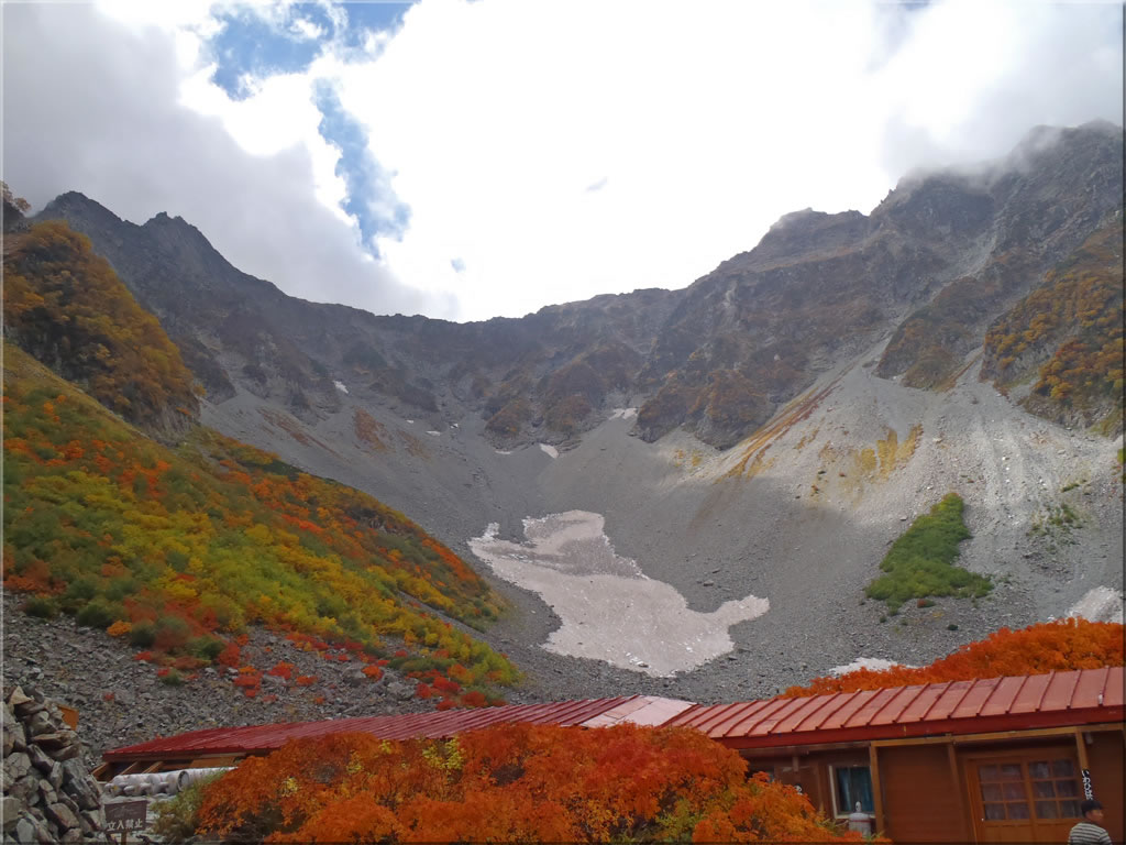次の2枚は途中で撮影した涸沢の様子。その後紅葉には全く陽が当たらなくなりましたので、こちらの写真を載せておきます。