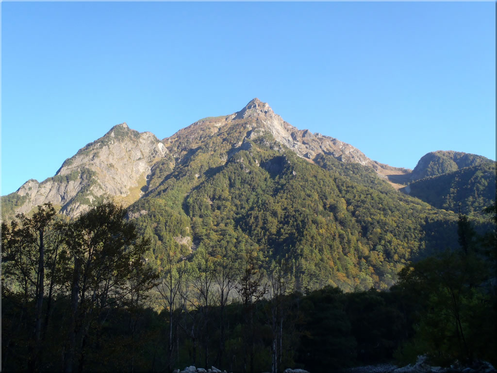 左にそびえる明神岳、前穂高岳。これからしばらくは常に左側に見ながら進んでいくことになりますが、場所と共にその姿も変わっていきます。今回はたくさんの写真でその変化を見ていきたいと思います。
