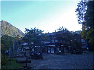 シャトルバス乗り場に行き、始発の5時40分過ぎに来たバスに乗って上高地に向かいます。駐車場からも分かるように、既にほぼ満席状態で、途中のバス停で乗る人は乗りきれず次のバスに回された人もいました。平日なのに恐るべしです。また補助席もみな使いましたので、途中のバス停で降りる人がいると補助席の人が全員席をたたんでを繰り返しましたので、バス停毎にかなり時間をとられて6時15分、やっと上高地バスステーションに到着。