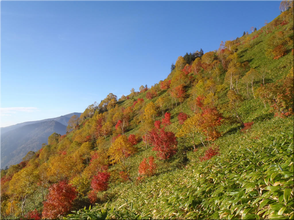 そして7時3分、開けたりんどう平に出ます。ここから目指す焼岳が見えてきますが、今回は焼岳本体よりもりんどう平の紅葉のすばらしさに息をのみました。