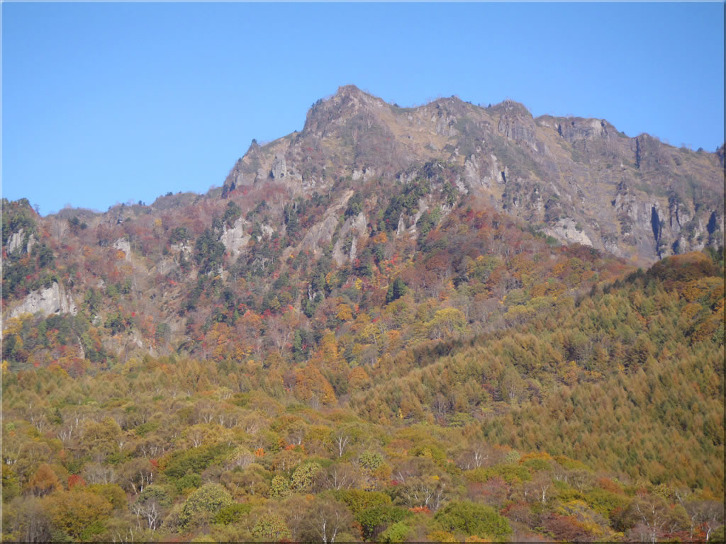 長野市内の渋滞を避けて信濃町ICに向かいますが、次の写真は途中で撮影した黒姫山の様子。紅葉はだいぶ下まで降りてきています。