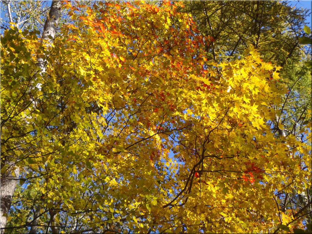 この辺りはまだ色付き始めたばかりという感じで、黄緑が主体です。日射しが無ければ、おそらく黄緑でなく緑に見えたことでしょう。