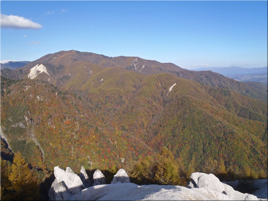 日向山をズーム。中腹の矢立石より上では紅葉が始まっていますが、まだ緑も少し目立ちます。やはりピークには1週間ほどは早かったかも知れません。(ただしこれからはどんどん寒くなっていきますので、紅葉が進む前に霜でやられる、あるいは強風で落葉してしまう可能性もあります。)