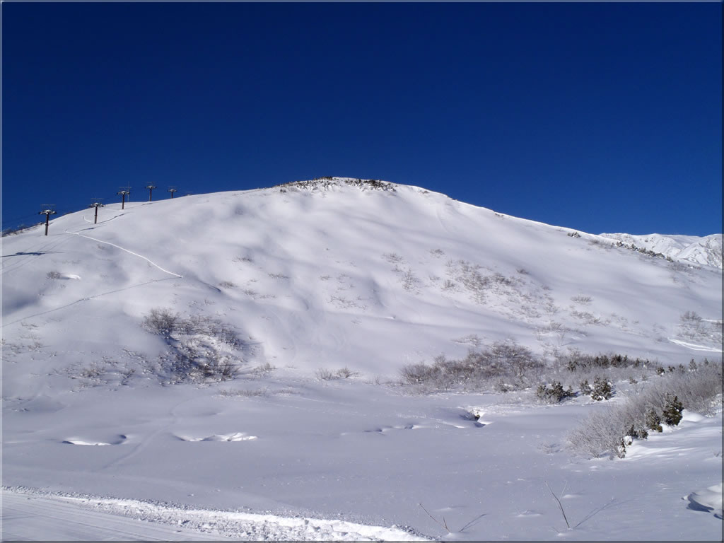 黒菱も同様でしたので、今回はゲレンデを滑るのは諦めてそのまま上に登ることにします。次の写真は一番上のゲレンデの様子。ここはまだオープンしていません。かすかに昨日?のシュプールが見えますが、ほぼ昨日の新雪でリセットされています。では私が最初にシュプールを刻むことにしましょう(^^)。
