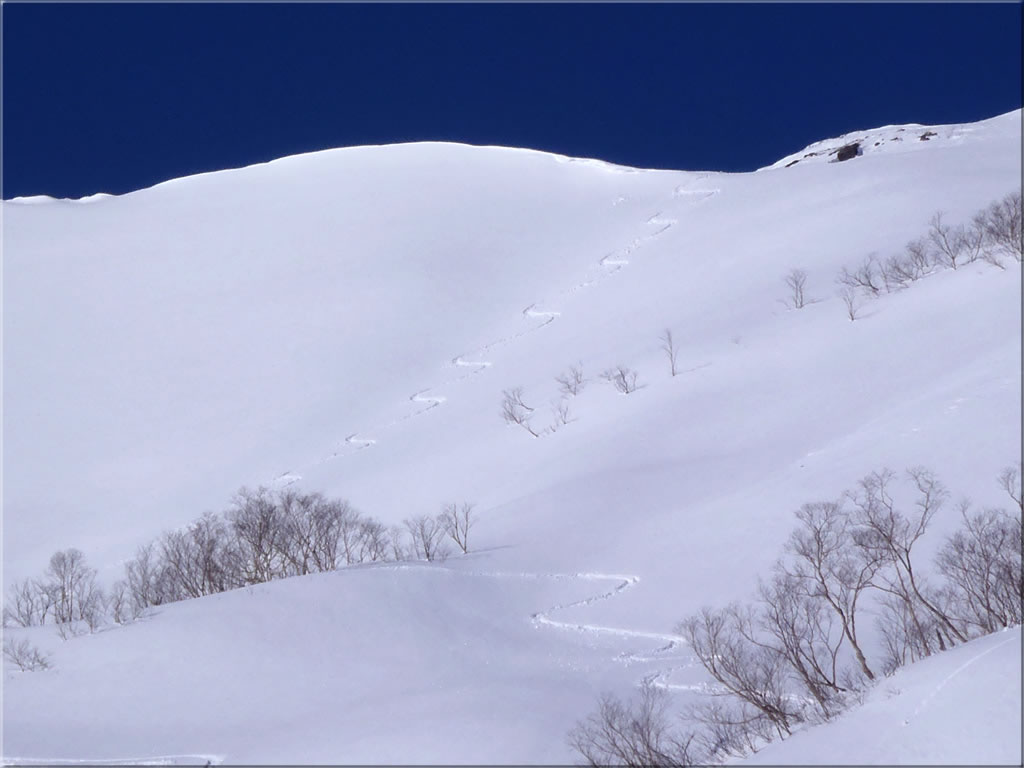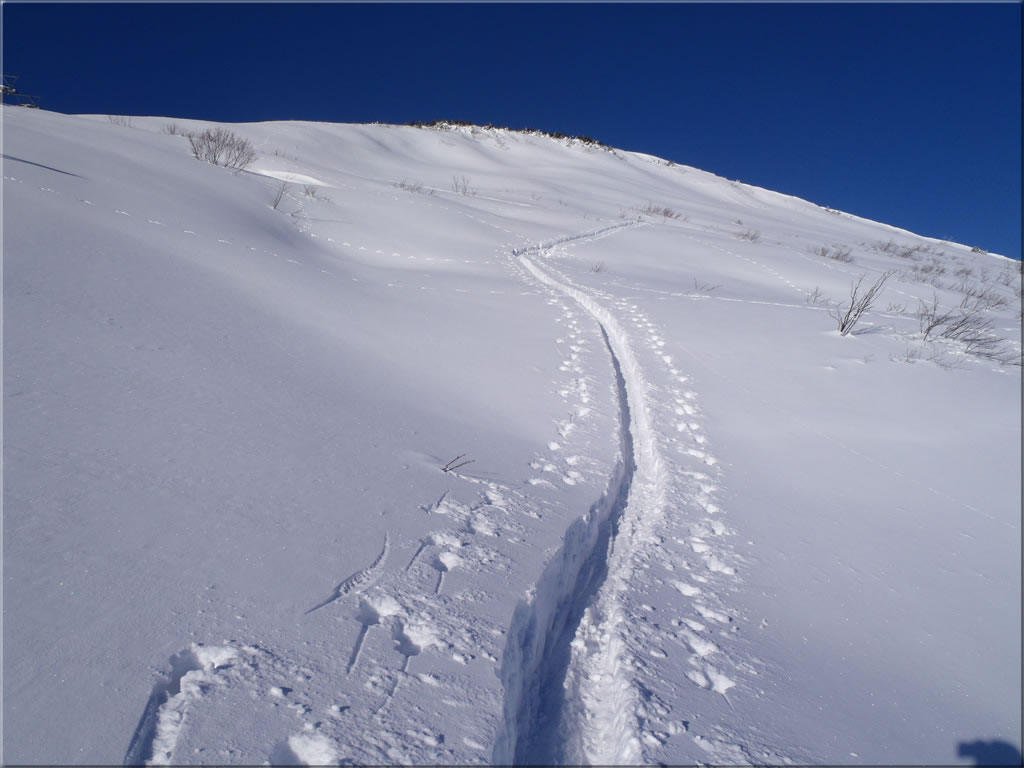 途中で先行者のトレースから外れて、今登ってきた斜面の上部に向かいます。