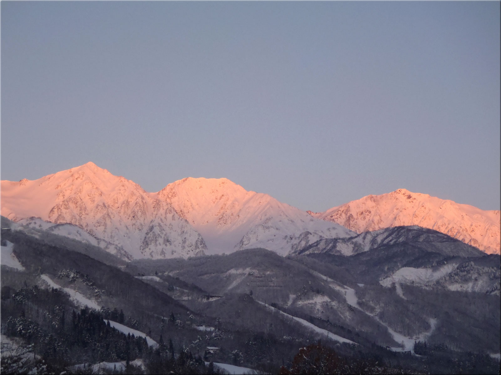 次の写真は6時54分のもの。朝日で北アルプスの山々が赤く輝き始めています。