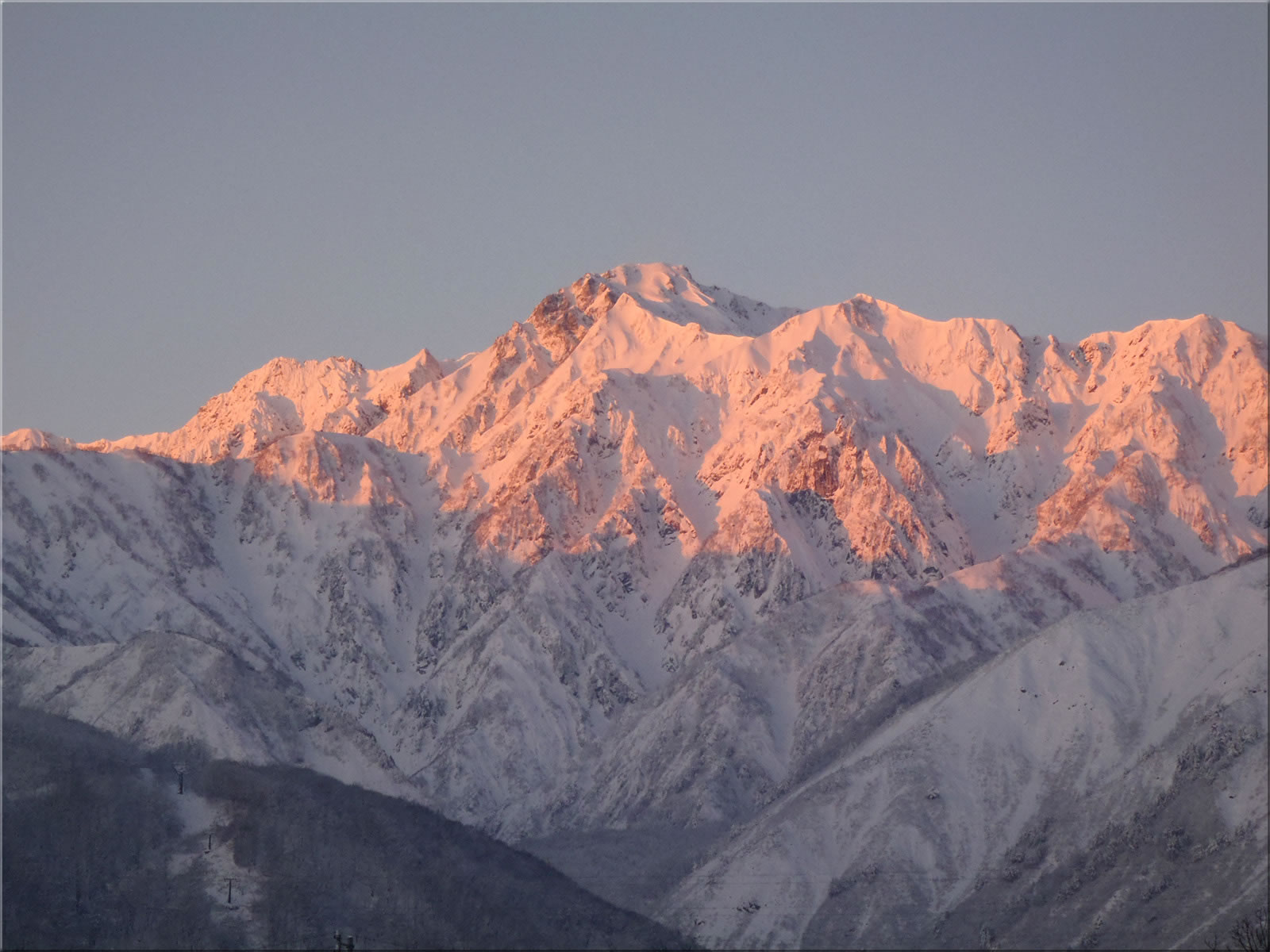 しばらくすると八方尾根スキー場にも陽が当たり始めましたので、スキー場をズーム。