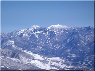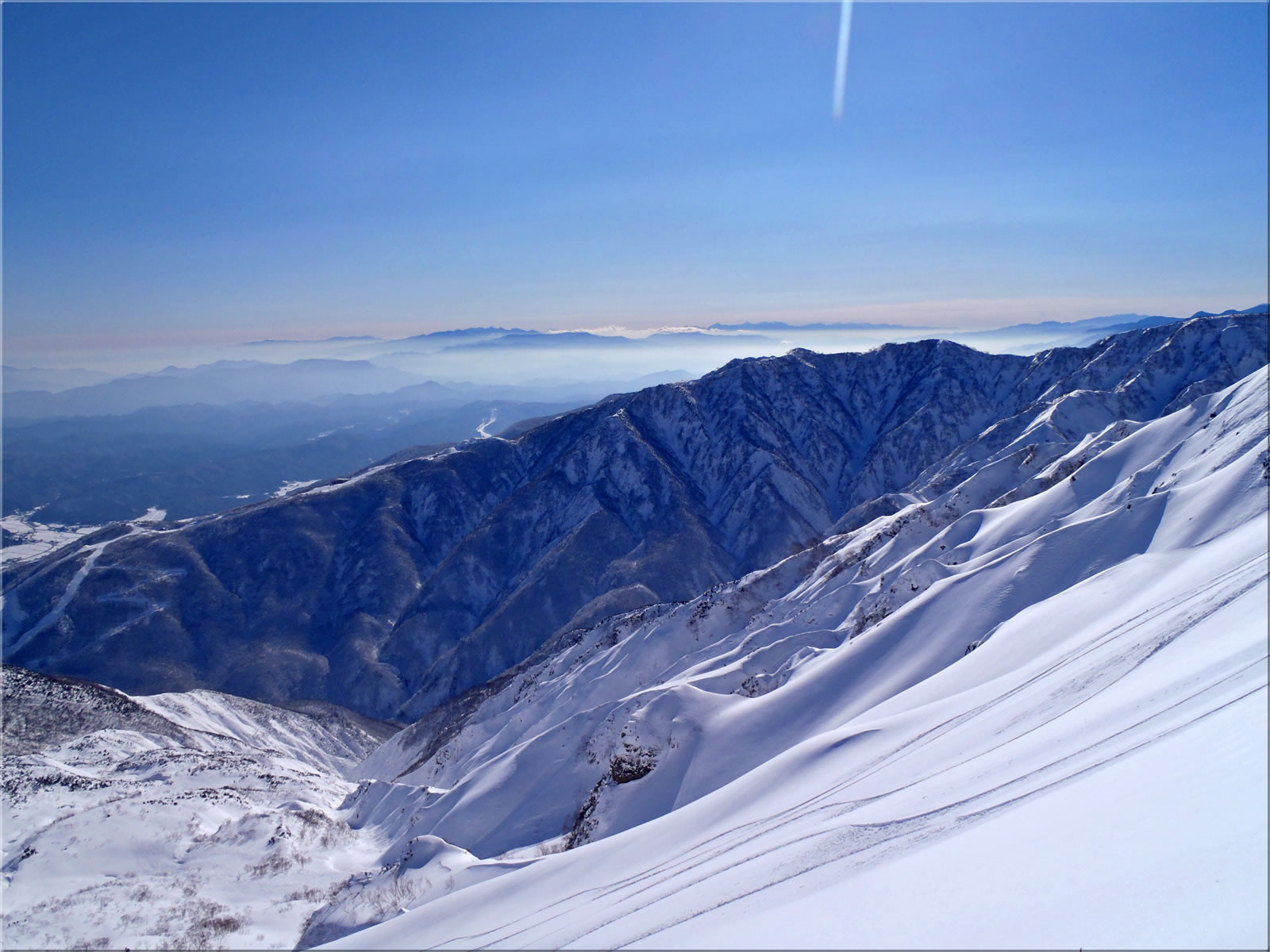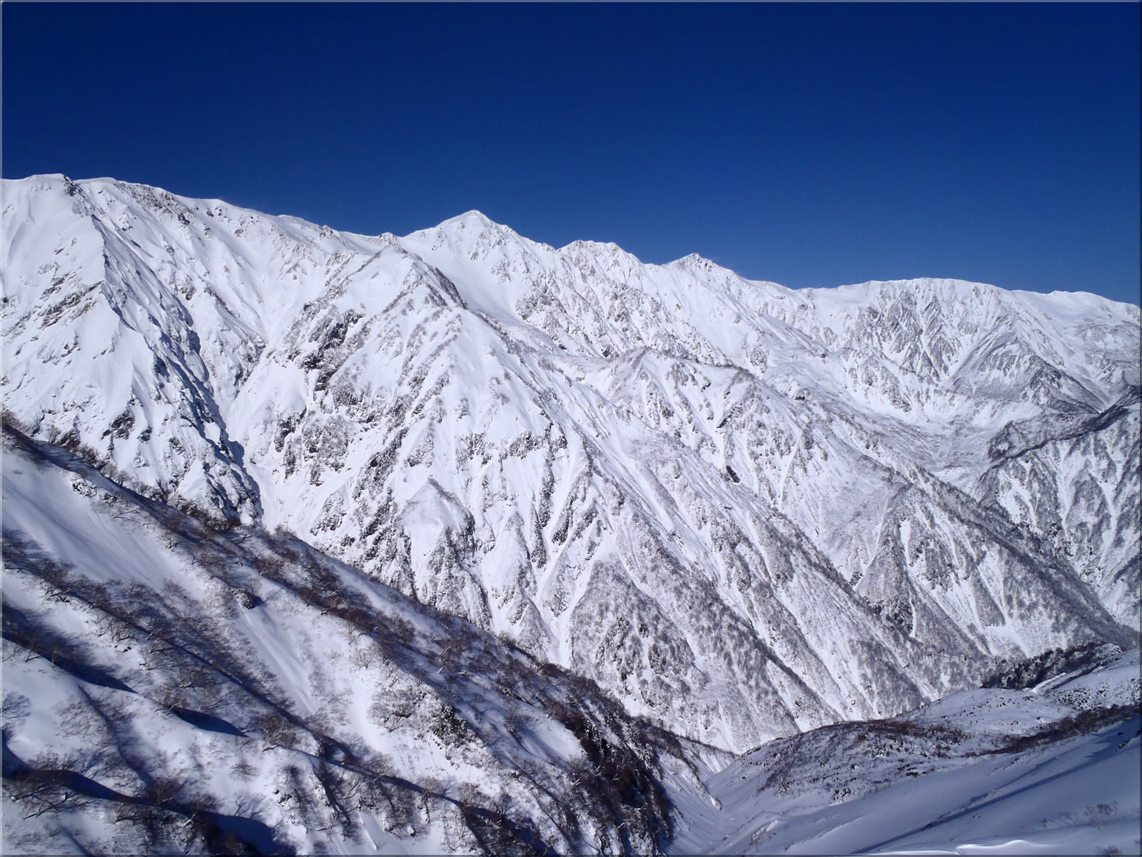 白馬乗鞍岳をズーム。白馬乗鞍岳の東斜面はなんとか滑れそうですが、その下の斜面がまだかなり藪っぽく見えます。