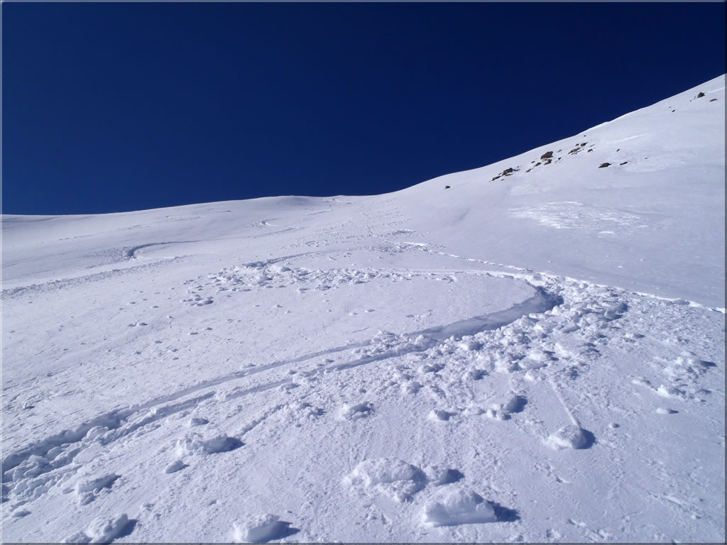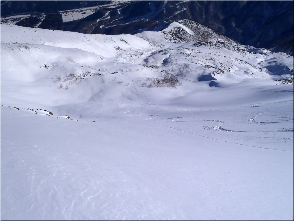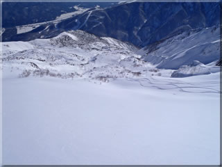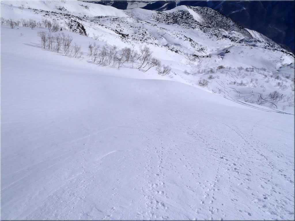 かなりな急斜面です。しかも午前中の日射しで湿った雪がこの時間になるとところどころで軽くもなか雪になってきていまして、気を抜けません。