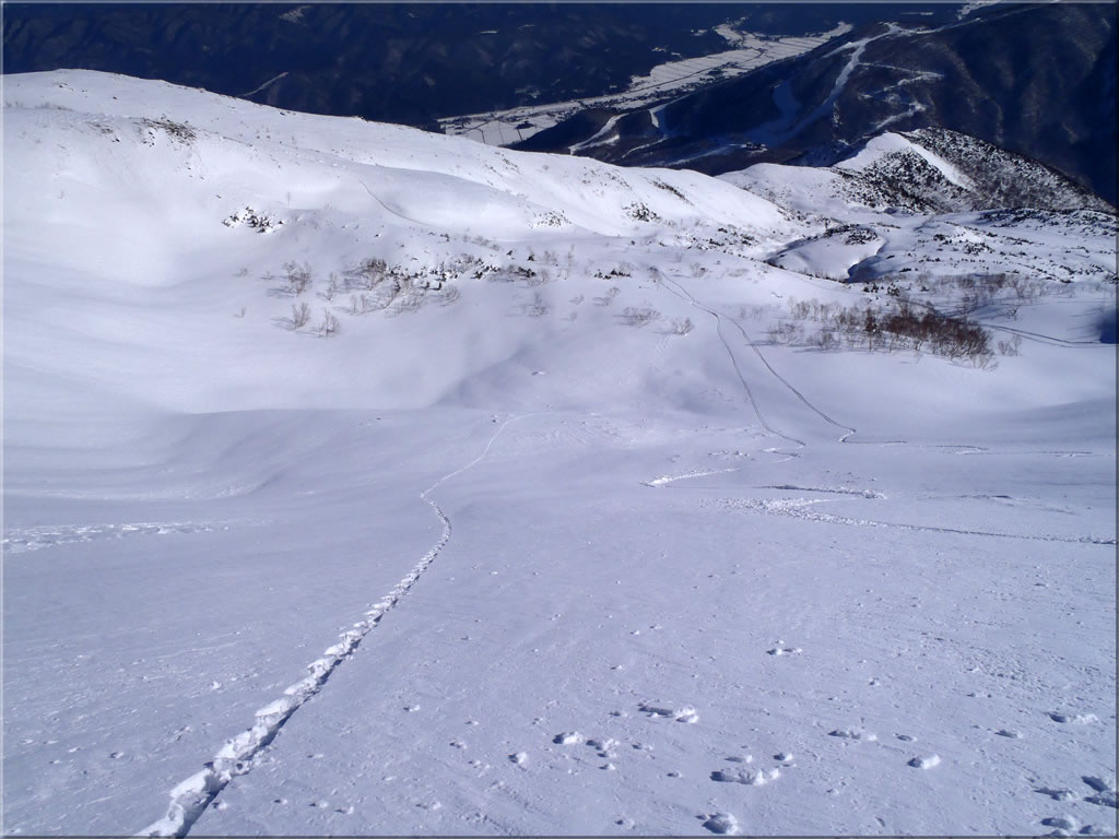 ではここから斜面を滑り降ります。今日のファーストトラックです(^^)。