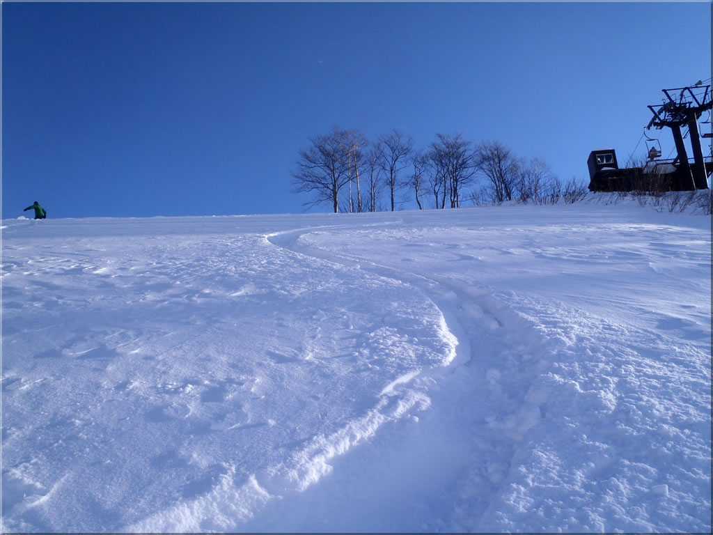 こちらの方は風の影響を受けていない部分が多く、膝程度のパウダーを味わうことが出来ました。
