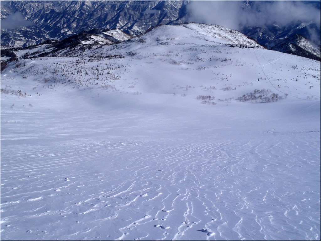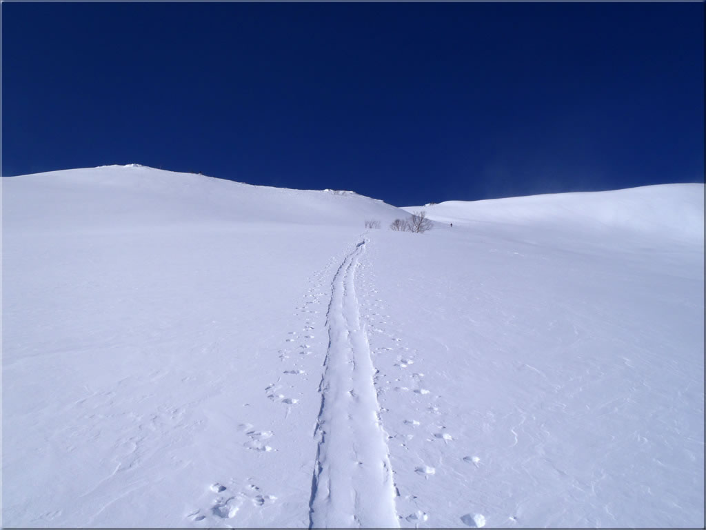 斜面の藪もほとんど埋まり、滑るには全く問題ありません。既に3人ほどの先行者が斜面を登っていくのが見えます。ただそのトレースがほとんど消えかけているのが少し気になります。風でパックされ堅い斜面になっているのかも...。