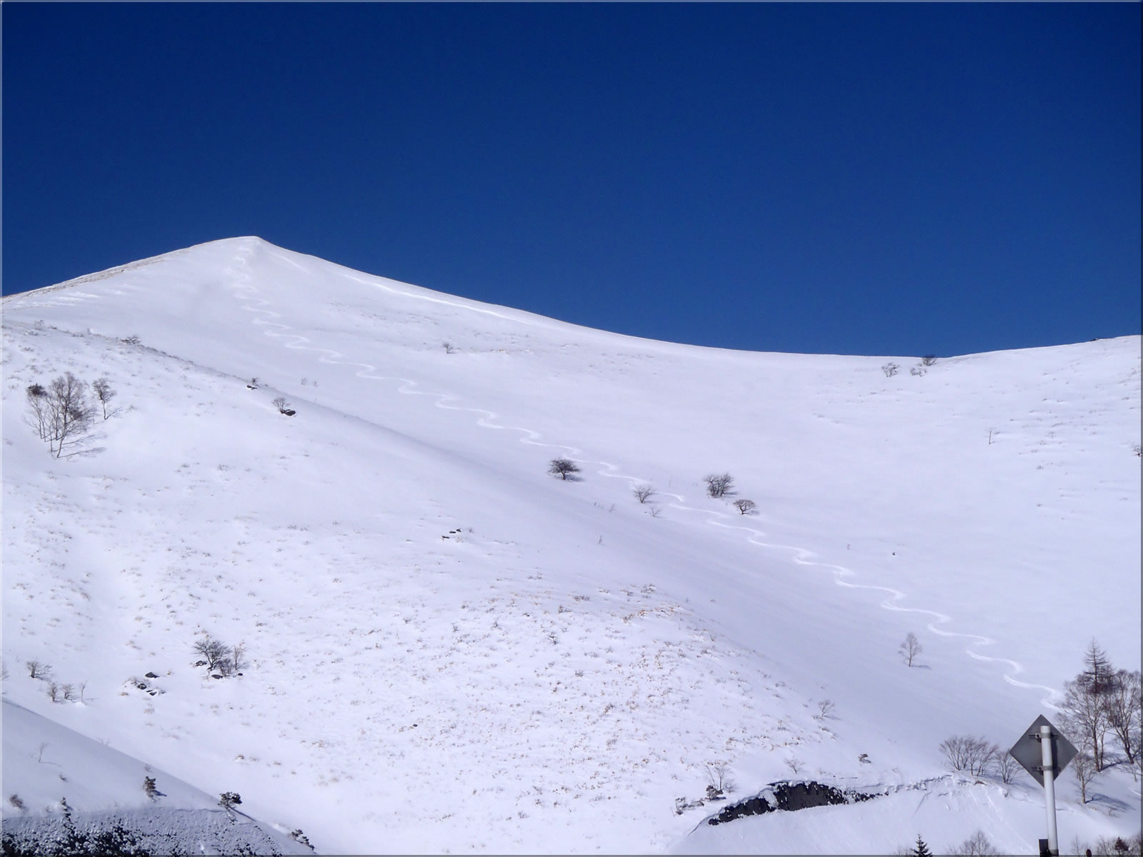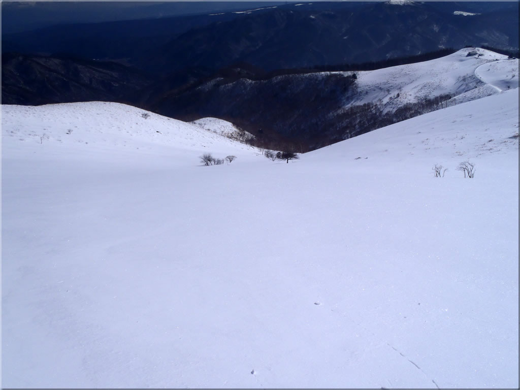 では再びシールを付けてビーナスラインをドライブイン手前までも戻っていきます。次の2枚はその途中で見た斜面の様子。