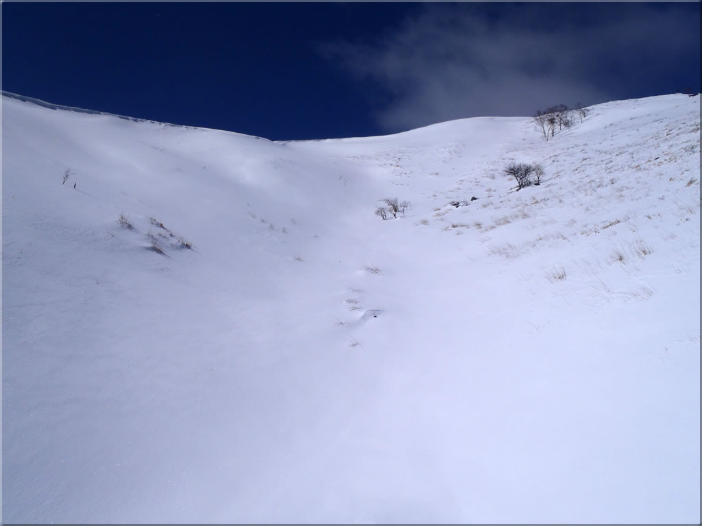 山頂直下の吹きだまりの斜面は、パック気味ながら20cmほどの新雪が吹きだまっていました。