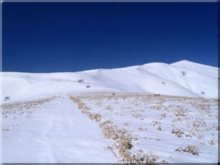 前日、標高の高いところでは降雪があったようで、しかも今日は高気圧に覆われて快晴が期待できたことから、三峰山東斜面にもまだパウダーが積もっていることを期待してこの日の午前中、バックカントリーに出かけてきました。天気は予想通り、最高でした(^^)。雪ですが、昨日降ったと思われる10cmほどのさらさらの雪が積もっていましたが、その下は堅めのバーンということで浅めのパウダーでしたが、まあこの時期でさらさらの新雪を滑ることが出来ただけ良かったです。