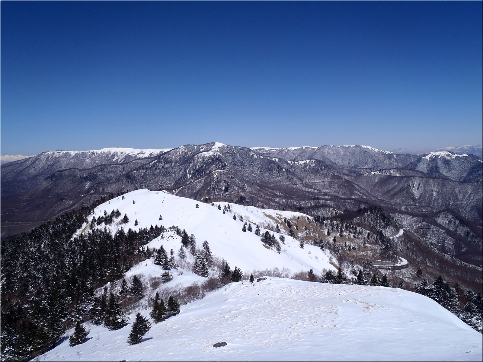 三峰山で新雪を滑ることが出来るのは、おそらく今日が今シーズンで最後のような気がしますので、頑張ってもう一度登り返してこの斜面を最後に滑ってみます。