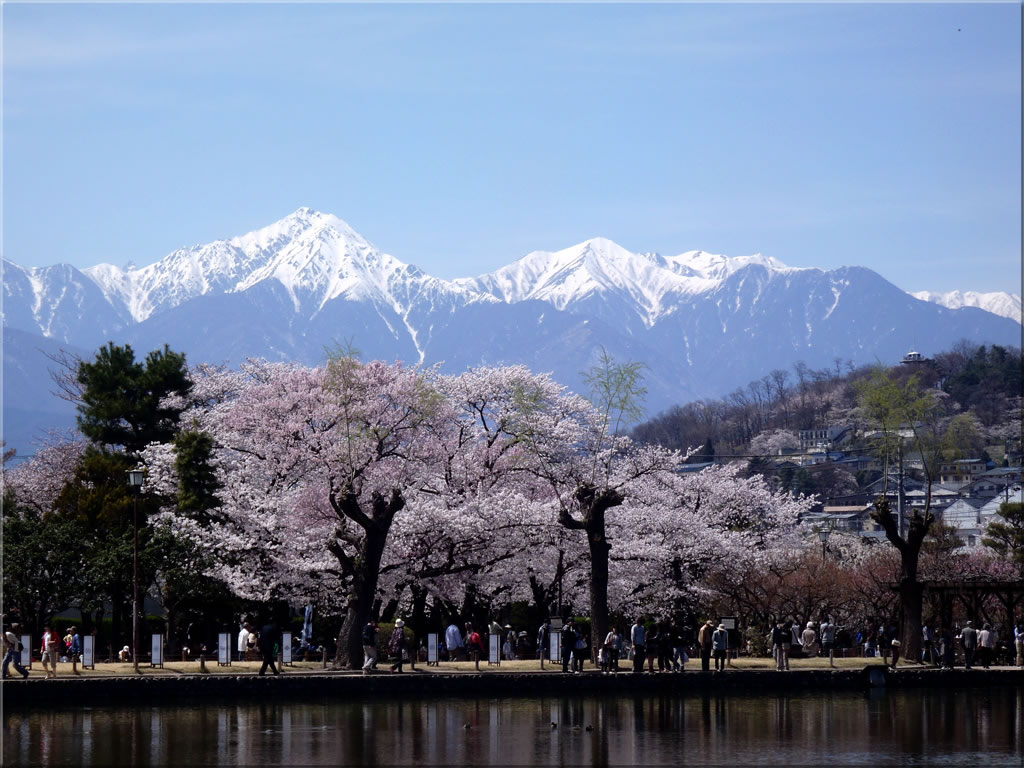 近くの有料駐車場に車を停めて松本城に向かいます。松本城に到着11時55分頃でした。少し薄雲が出てきましたが、でも気持ちよい春らしい快晴で、風も弱く心地よいです。まずは松本城のとなりに北アルプスの白い山々が見える撮影ポイントから1枚。