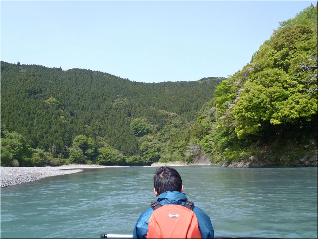 快晴の青空の下、新緑の渓谷を下るのは本当に最高です(^^)。しかもこの辺りはまだほぼ無風でしたので。