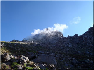 山頂で1時間ほどのんびりとしていましたが、その間誰も登ってきませんでした。今日は天気も良いのに焼岳に登る人は少ないのかなあと思っていたのですが、下り始めたら次から次へと登ってくる人とすれ違いました。