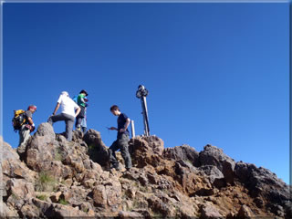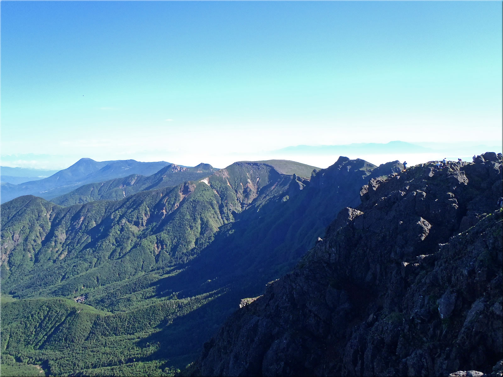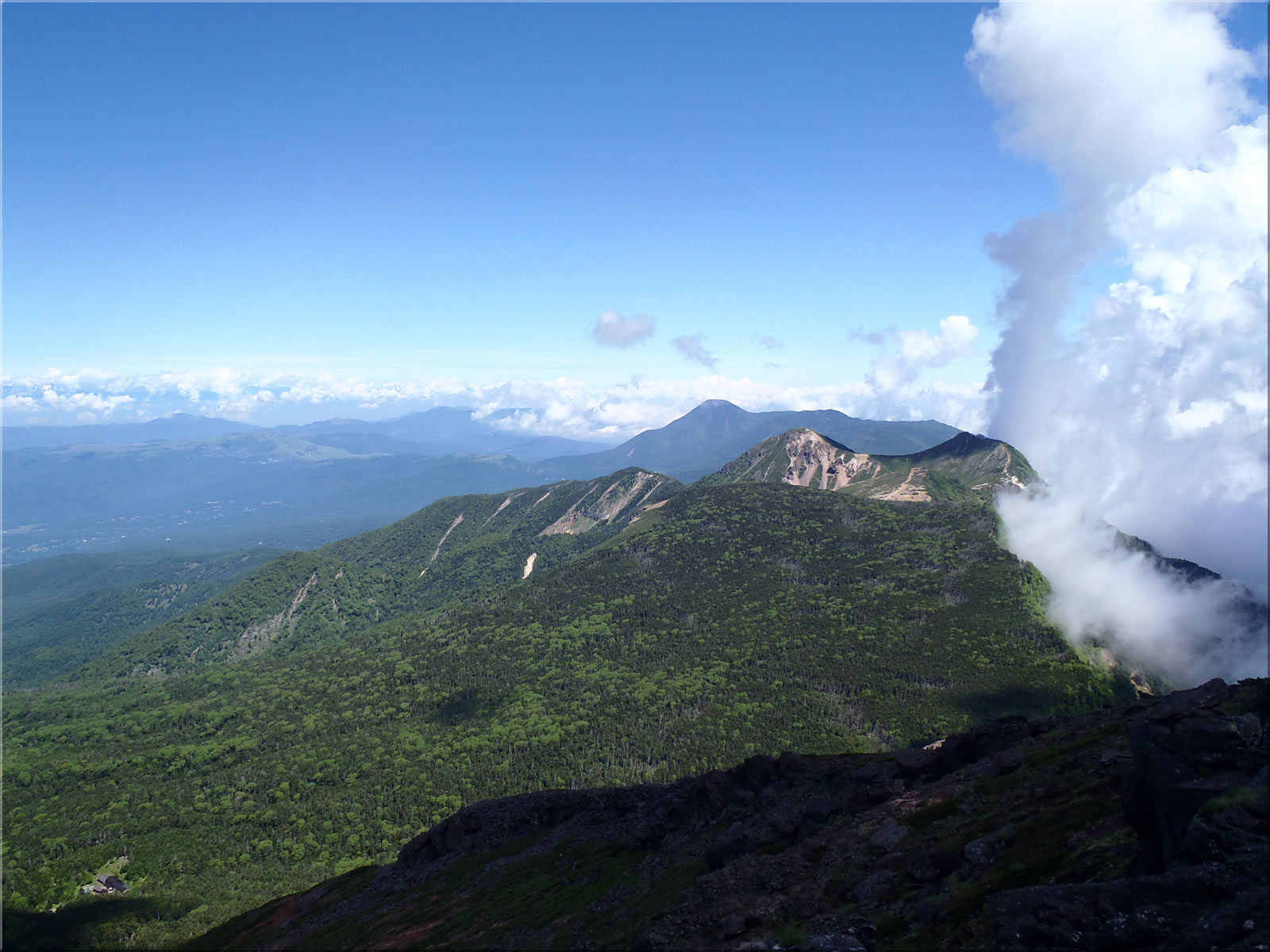 9時42分、硫黄岳山頂到着。東側にわいたガスで日射しが遮られていますが、でも西側半分は快晴なのです。