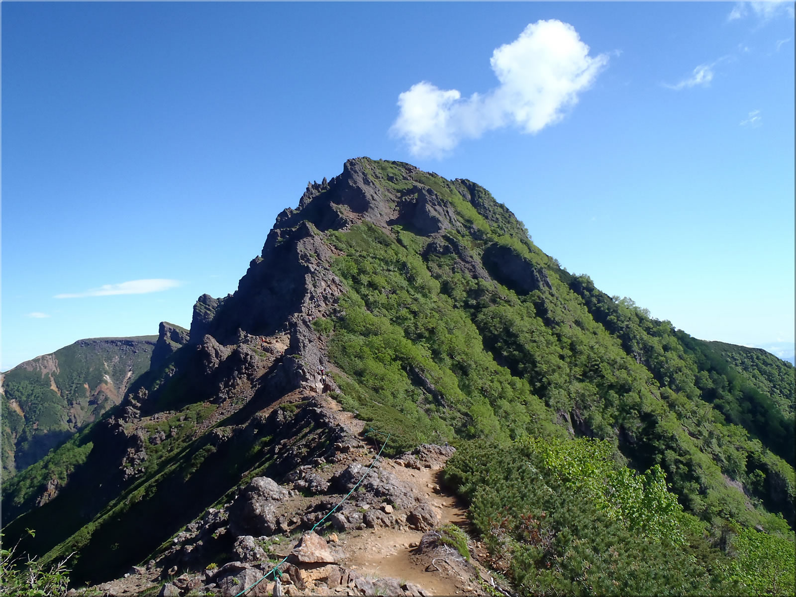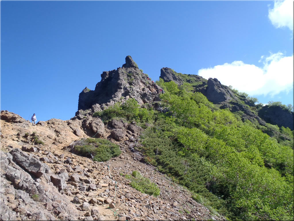 権現岳への分岐を過ぎると、急な岩場をよじ登って進んでいきます。