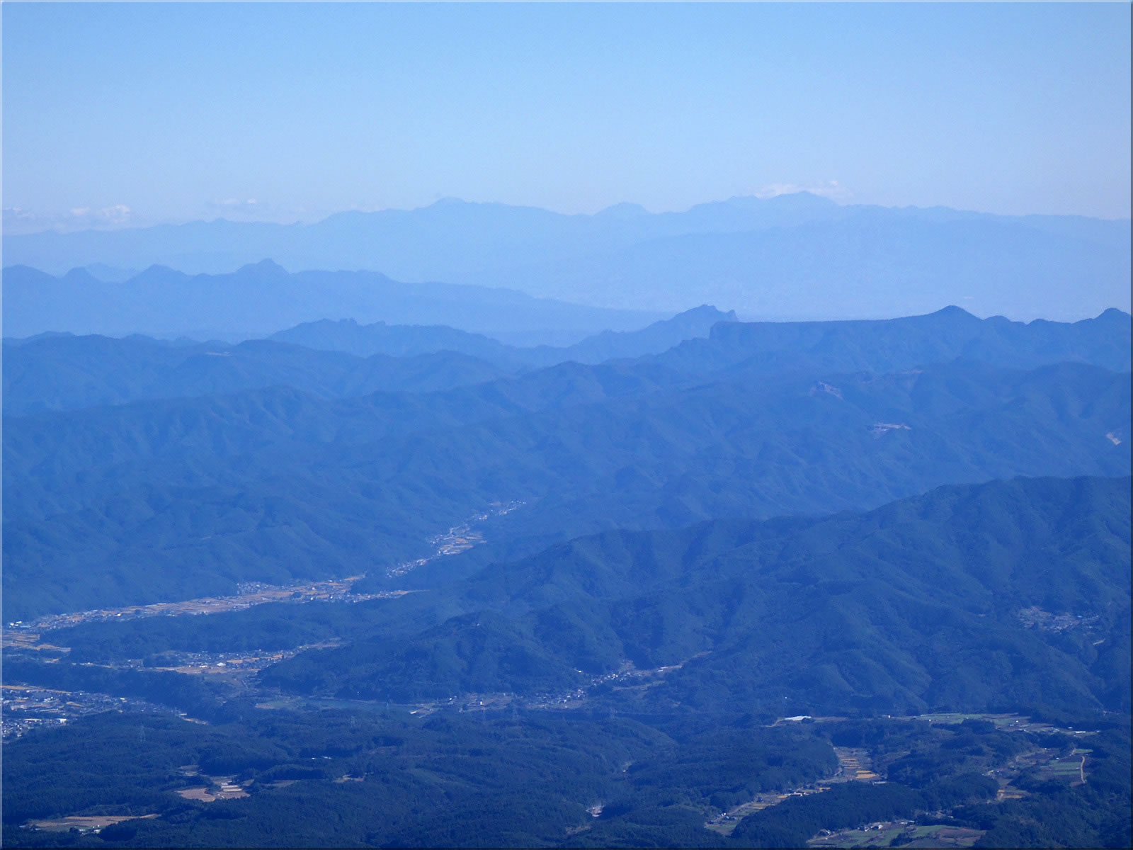 その北側の北アルプスをズーム。白く見えているのは立山でしょうか。