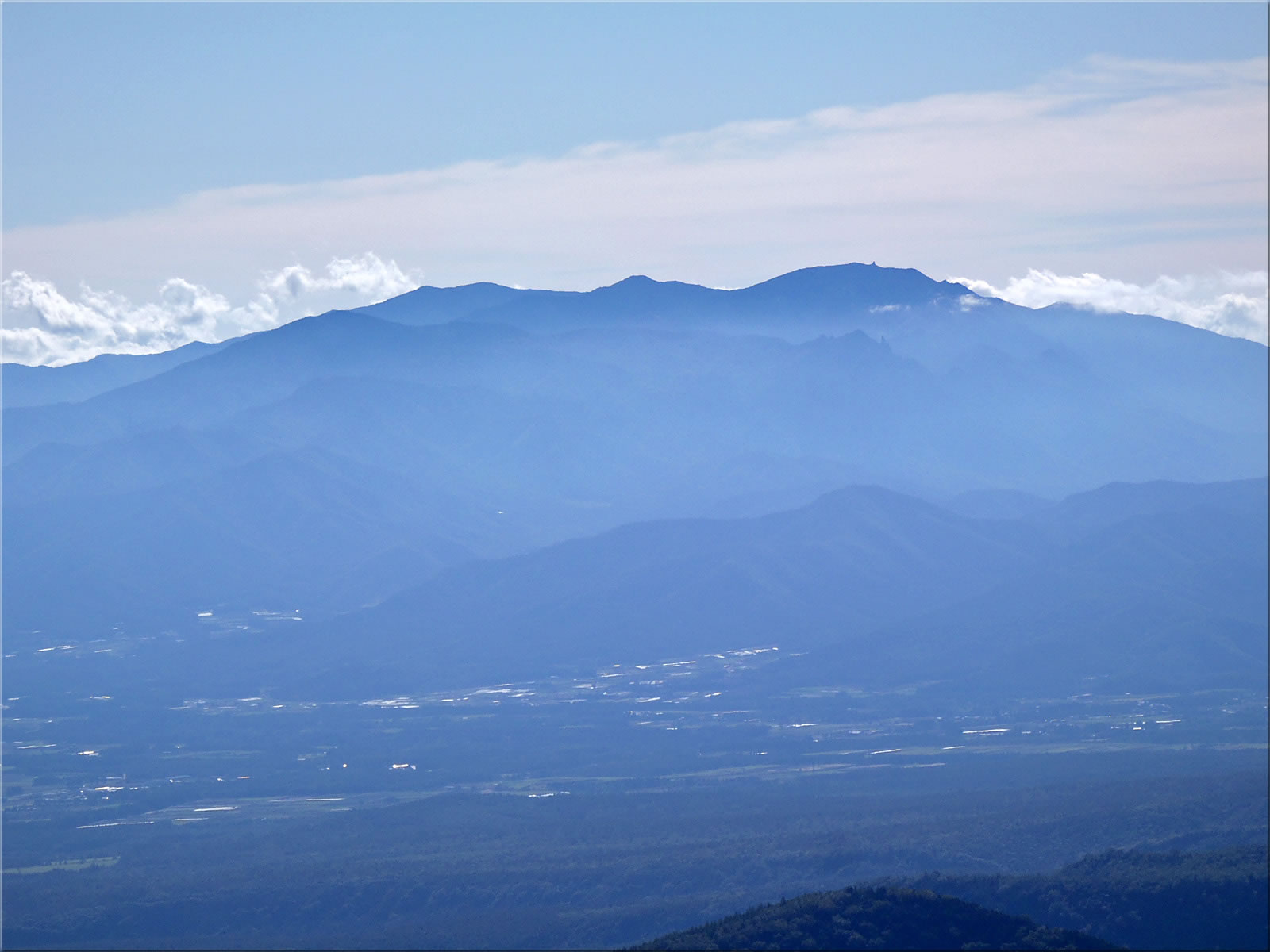 丸山、高見石をズーム。その向こうに北アルプス槍穂高もきれいに見えています。
