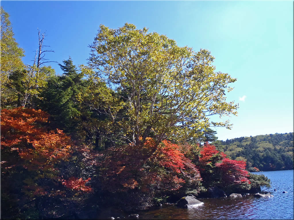 ドウダンツツジの紅葉ですが、ピーク少し手前という感じですが、十分にきれいです(^^)。風が若干あって湖面に小さな波がたっていますので、鏡のように湖面に映る紅葉は今回は見れませんでした。