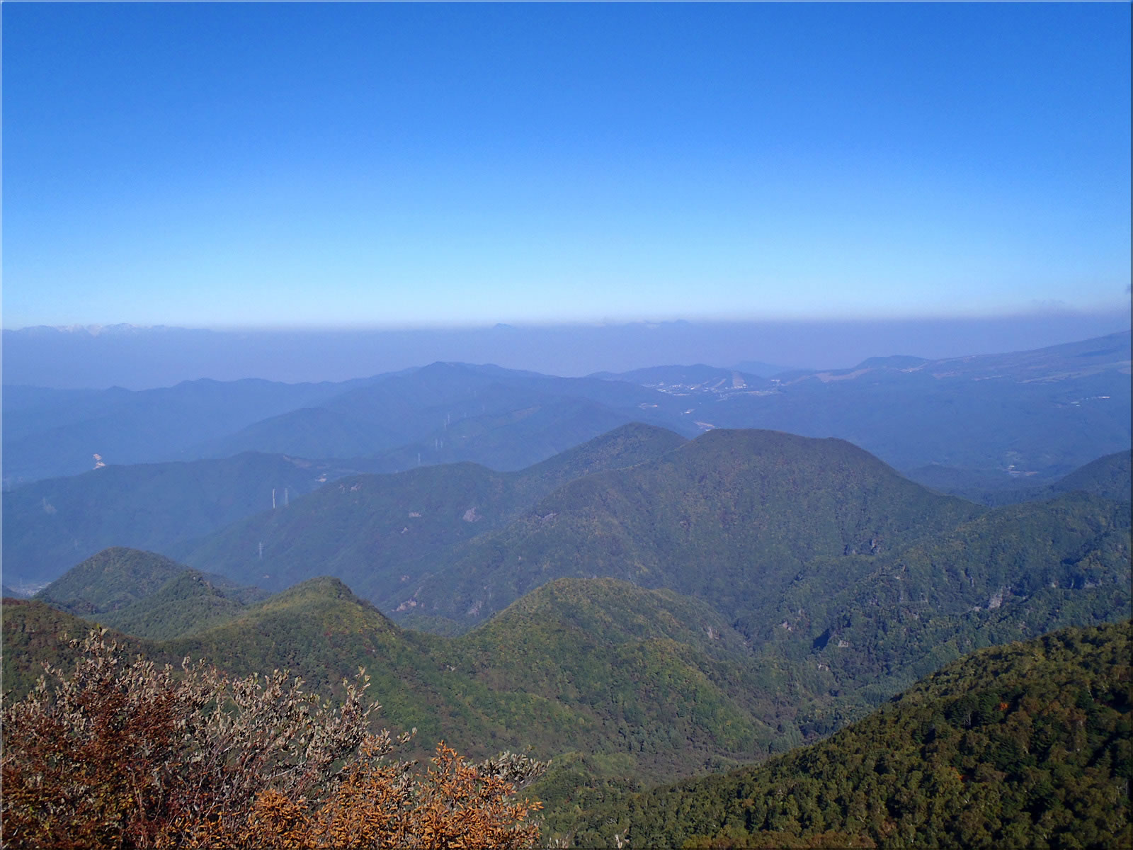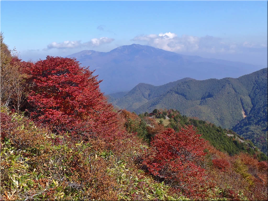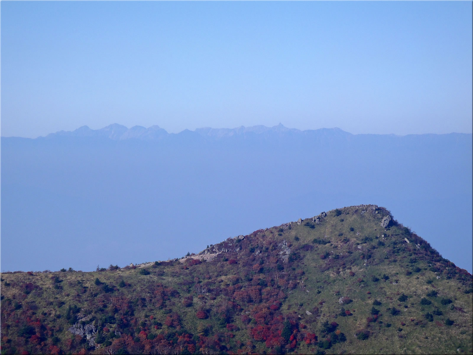 展望ですが、上空には雲はないのですが、下の方がかすみ気味で、北アルプスはなんとか全部が見えているものの、中央アルプス、八ヶ岳などはかすんでほとんどみえませんでした。四阿山方面は雲がかかっていて、ああ今日は紅葉も展望もいまいちだったかなとがっかりしかけたのでした。