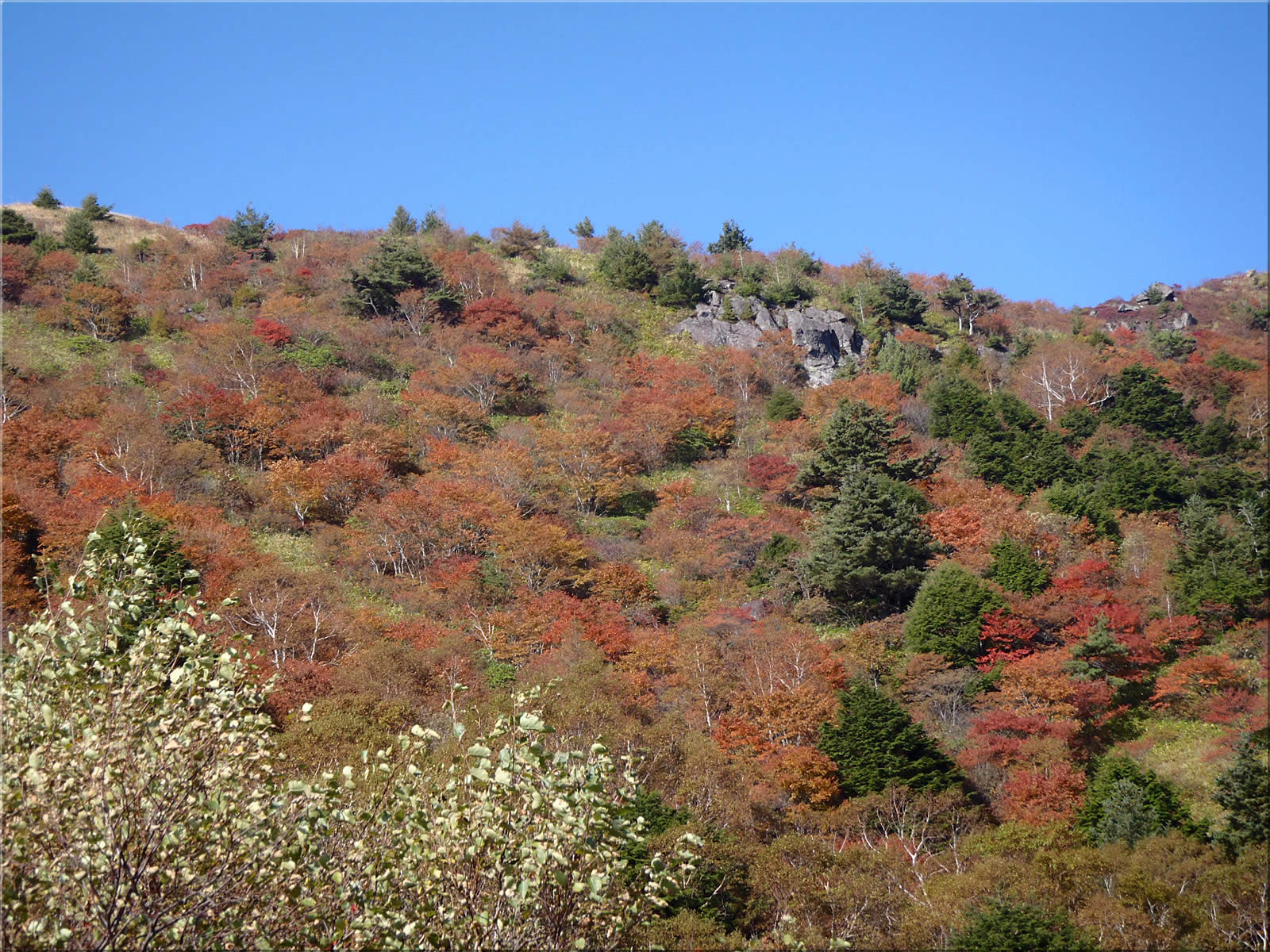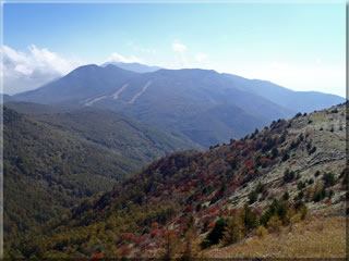 昨年よりは少し早いこともあって、斜面の紅葉は今回の方が多いように見えましたが、でも実際には枯れて茶色くなった葉が目立ちました。今年の紅葉はどこもいまいちという話を聞きますが、湯の丸山よ、おまえもか、の気分でした(^^;。