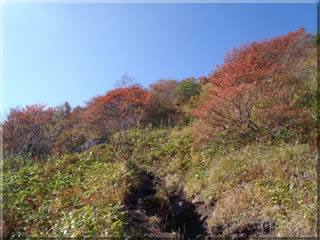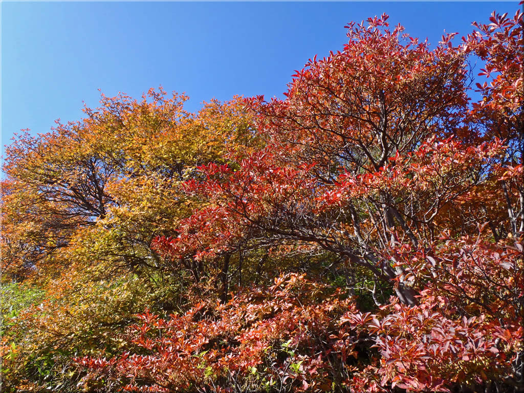 今回ですが、烏帽子岳の斜面はまさに今がピークという感じで実に見事でした。ただし湯の丸山は、上の方は風が当たりやすいせいか、ほかの高山と同じように紅葉前に茶色に枯れてしまった葉も目立ち期待したほどではありませんが、その反動もあっては烏帽子岳や戻る途中の登山道周辺の紅葉のきれいさには感動しました(^^)。
