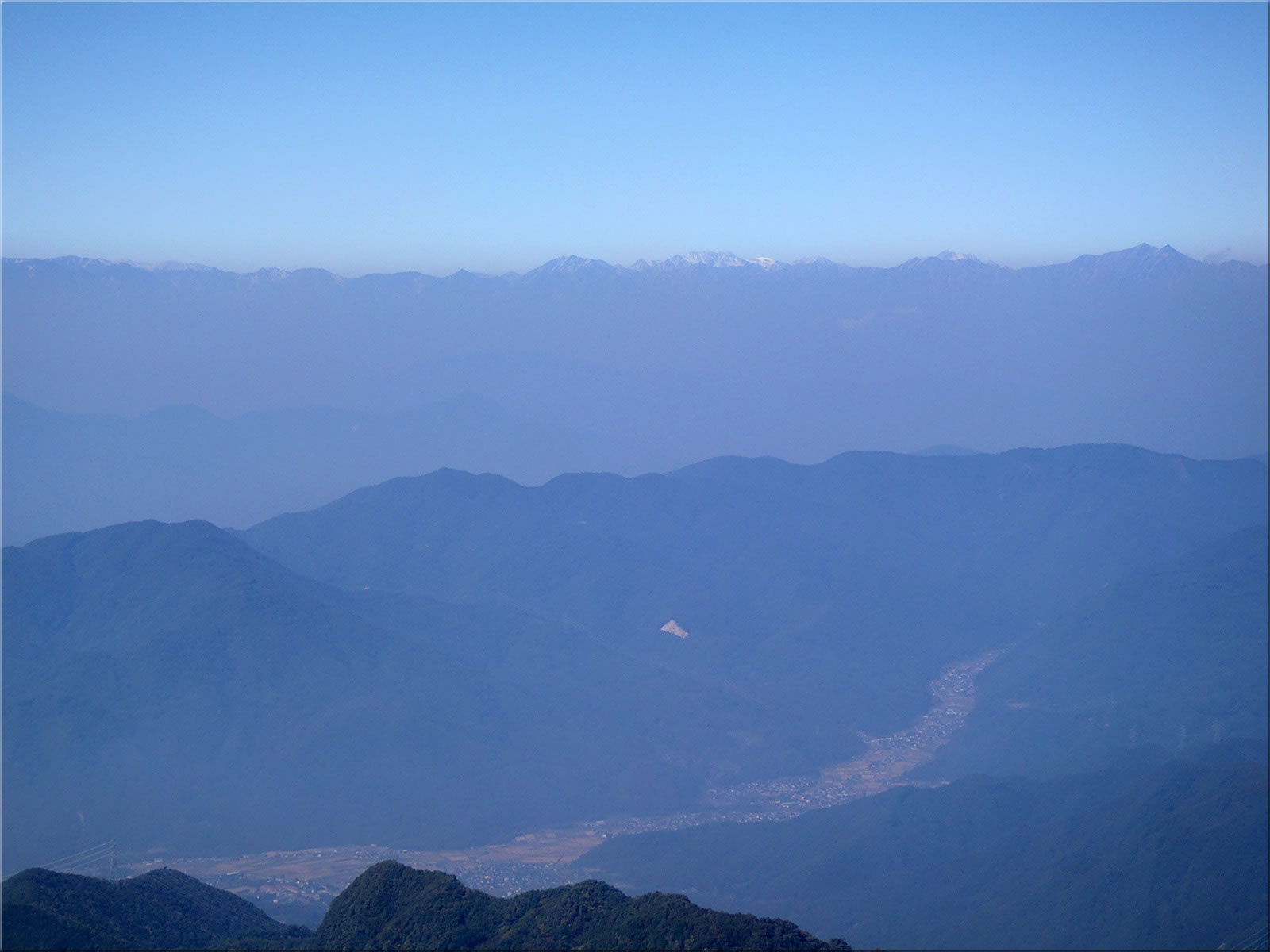 北アルプス鑓穂高をズーム。手前に見える街は上田だと思います。