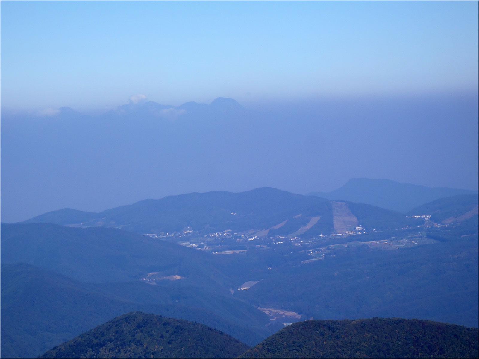 菅平高原をズーム。その向こうのかすみの上にちょこんと見えるのは妙高でしょうか。