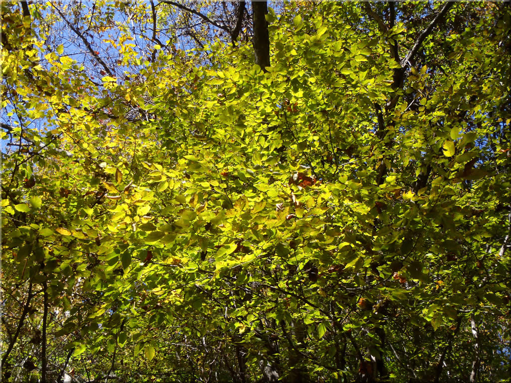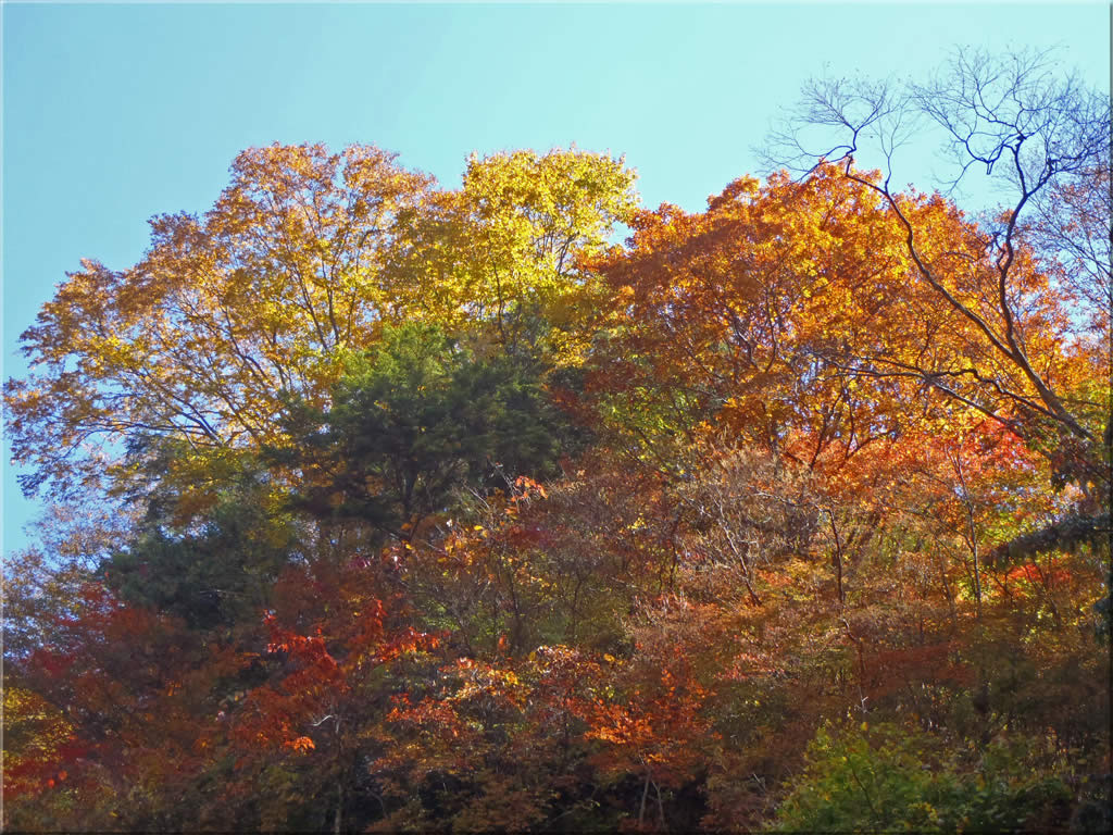 日射しがほぼ真上から当たるようになり、斜面の紅葉が一段と輝いています。少し動いては撮影と、なかなか足が前に進みません(^^;。