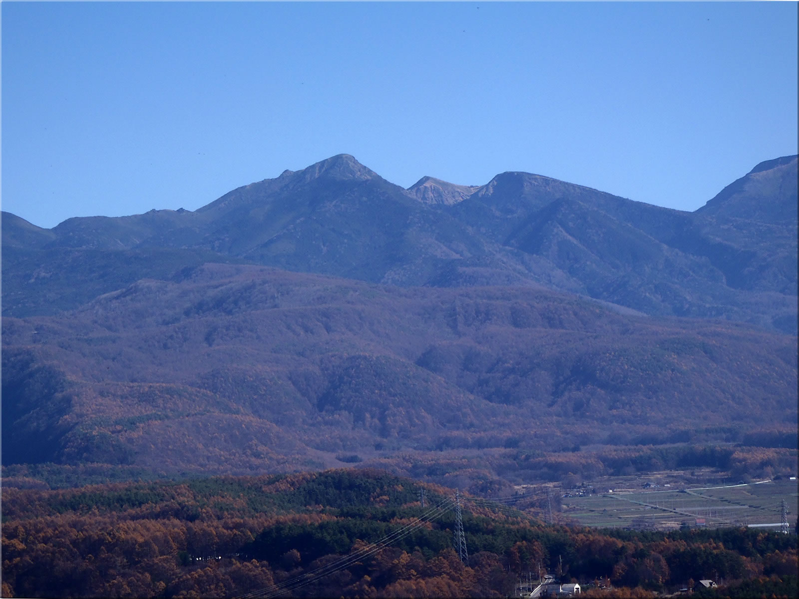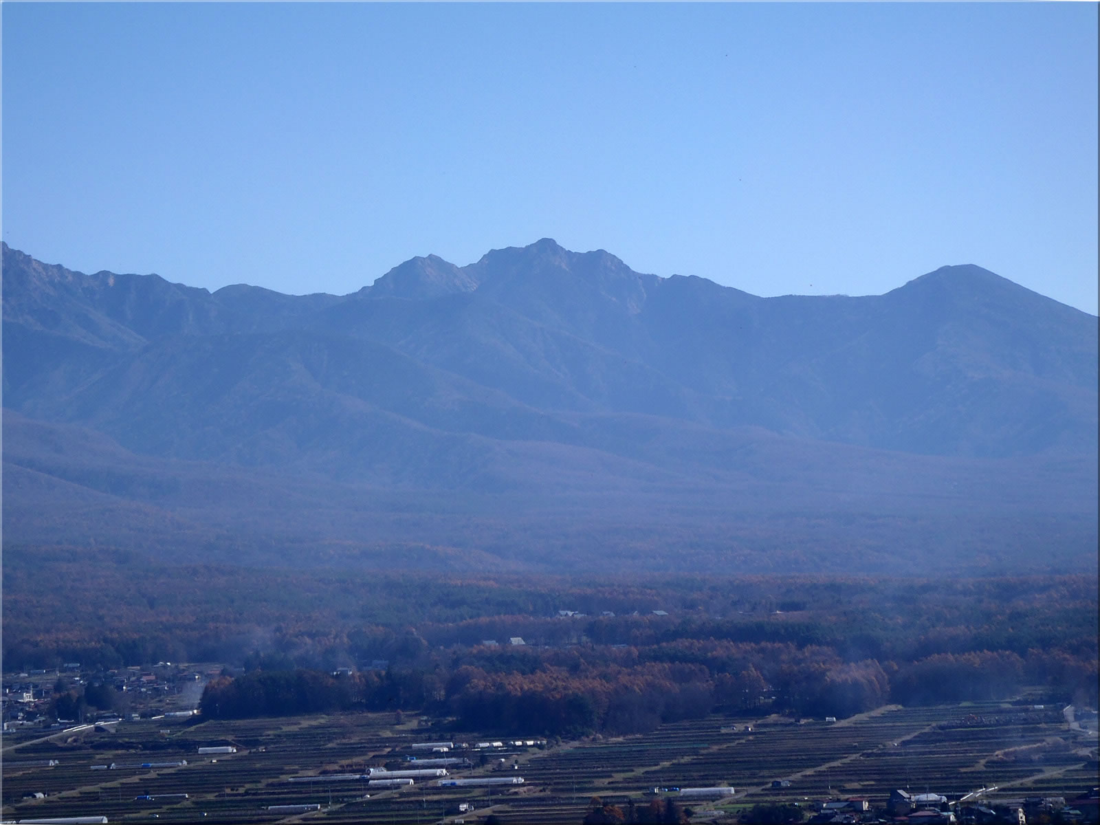 甲斐駒、鋸岳方面をズーム。右側に見えるのは仙丈岳かなあ。手前に見えるのは大泉山。
