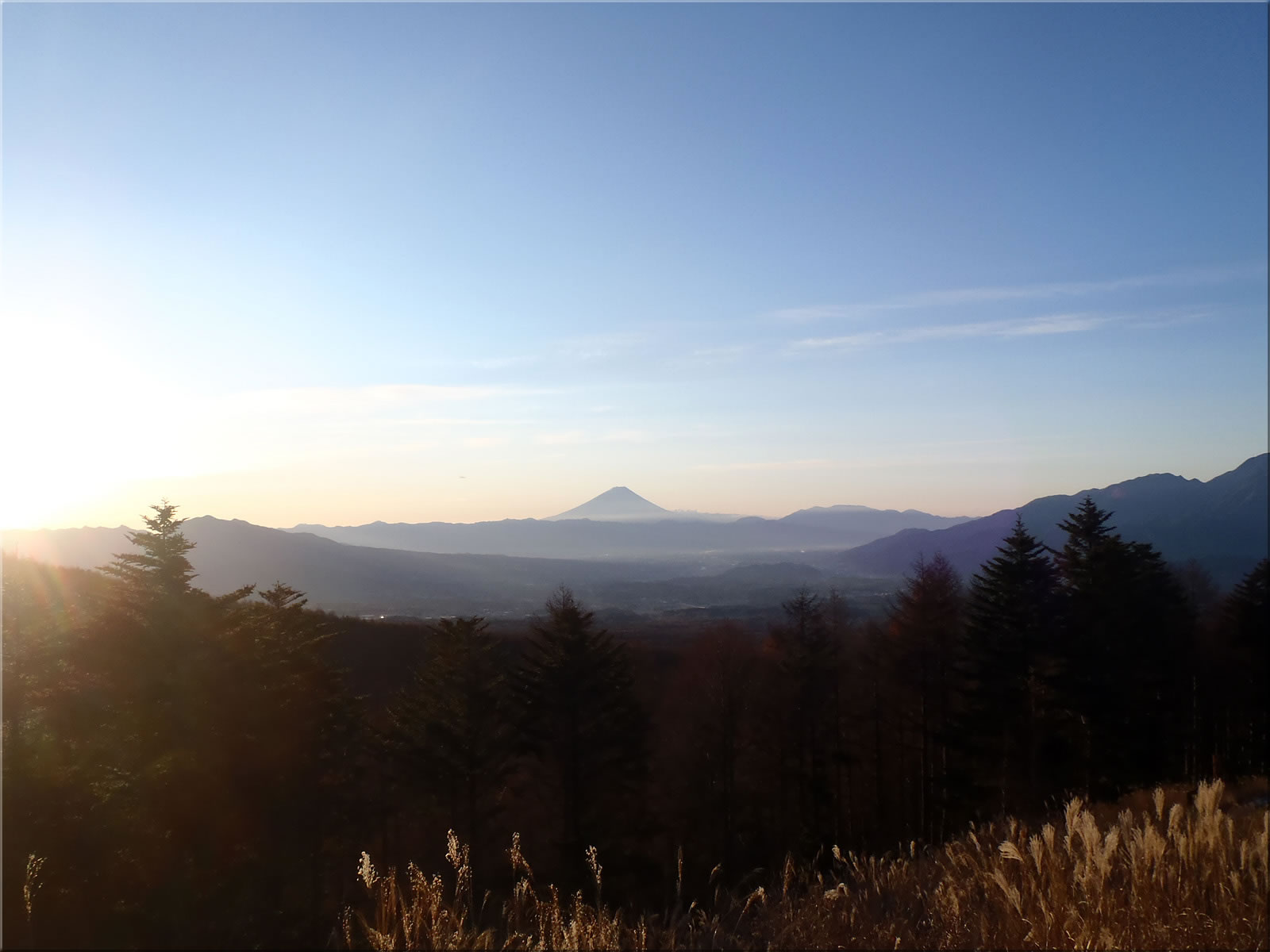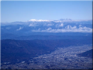 富士山方面。甲府盆地の方も、まだそんなにもやっていなくて街並みまで見えています。