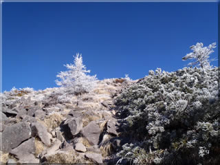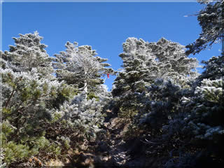 本格的な冬山になる前に、最後にもう一度八ヶ岳に登りたいと思っていたのですが、この日は高気圧に覆われて快晴が約束されていましたので、たまらずに午前中だけ仕事をお休みして八ヶ岳南端の編笠山に登りに出かけてきました。前日、上の方が白くなっていたことから、積雪状況が心配でしたが、でも実際に登ってみると雪はほとんどなく、山が白く見えたのは一面の霧氷のためでした。