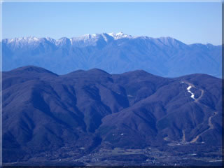 中央アルプス北部をズーム。手前は入笠山、富士見パノラマリゾートが見えています。