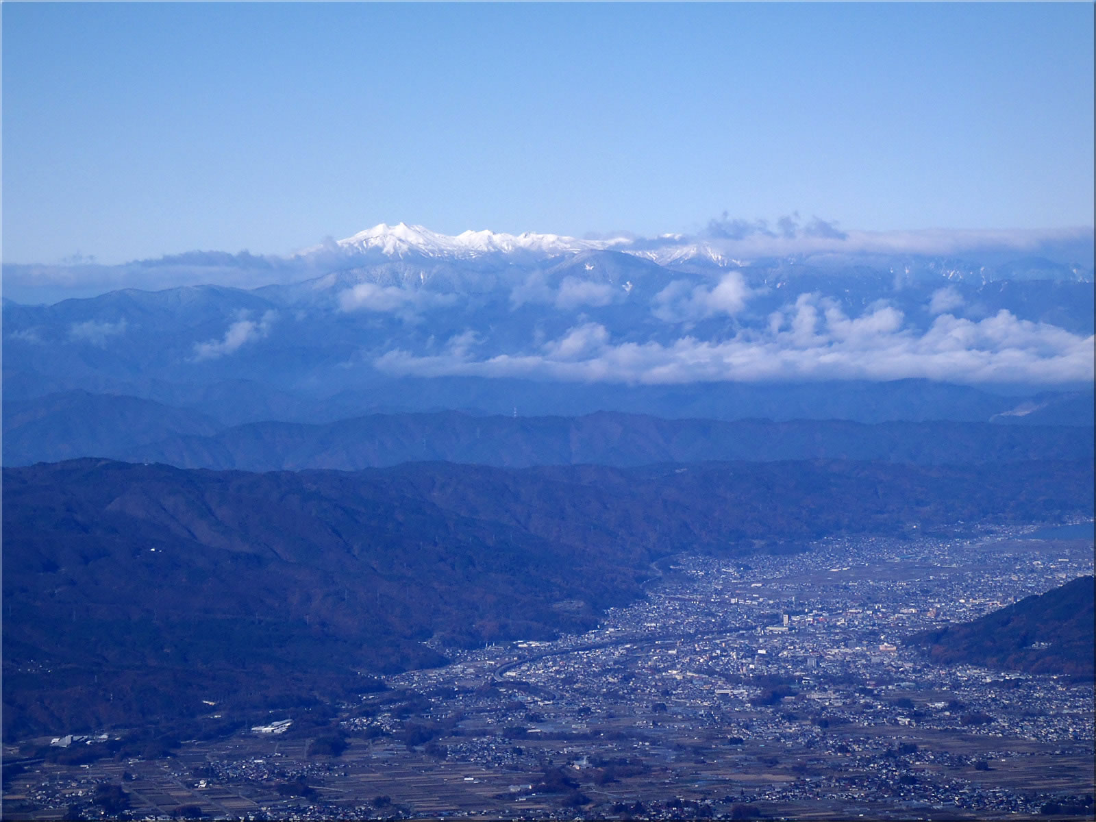 北アルプス槍穂高方面をズーム。手前の雲が少し邪魔ですが、真っ白になったピークがきれいに見えています。