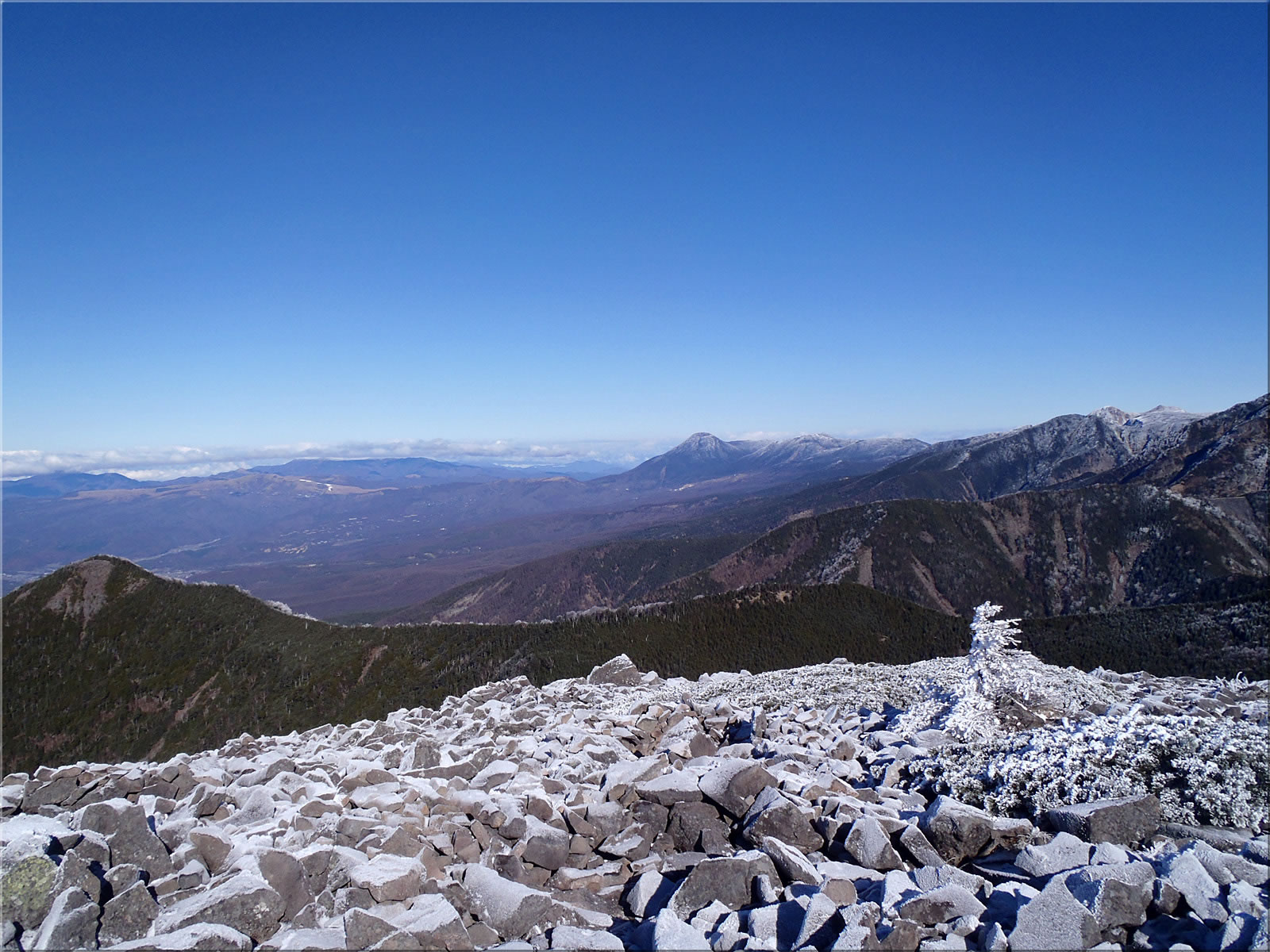 登ってくるルートはそれほど風は強くなかったのですが、山頂は吹きさらしで西からの冷たい風が強く、体が一気に凍えます。快晴でもやはり高山は初冬の寒さです。